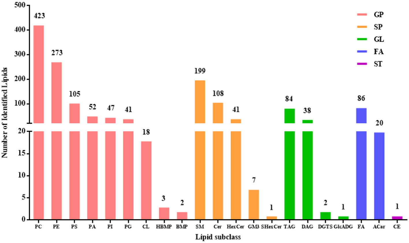 A total of 1,552 lipids, spanning five categories and 21 subclasses, were detected in DM (Figure 1). The composition by category was as follows: 964 glycerophospholipids (GP, 62.11%), 356 sphingolipids (SP, 22.94%), 125 glycerolipids (GL, 8.05%), 106 fatty acyls (FA, 6.83%), and 1 sterol lipid (ST, 0.06%). The identified lipid subclasses consisted of 423 glycerophosphatidylcholine (PC) (27.26%), 273 glycerophosphatidylethanolamine (PE) (17.59%), 105 glycerophosphatidylserine (PS) (6.77%), 52 phosphatidic acid (PA) (3.35%), 47 glycerophosphatidylinositol (PI) (3.03%), 41 glycerophosphatidylglycerol (PG) (2.64%), 18 CL (1.16%), 3 hemi-bis(monoacylglycerol)phosphate (HBMP) (0.19%), 2 bis (monoacylglycerol) phosphate ester (BMP) (0.13%), 199 sphingomyelin (SM) (12.82%), 108 ceramide (Cer) (6.96%), 41 hexosylceramide (HexCer) (2.64%), 7 monosialodihexosylganglioside (GM) (0.45%), 1 sulfatides hexosyl-ceramide (SHexCer) (0.06%), 84 triacylglycerol (TAG) (5.41%), 38 diacylglycerol (DAG) (2.45%), 2 diacylglyceryl trimethylhomoserine (DGTS) (0.13%), 1 glucuronosyldiacylglycerol (GlcADG) (0.06%), 86 free fatty acid (FA) (5.54%), 20 acylcarnitine (Acar) (1.29%), and 1 cholesteryl esters (CE) (0.06%).
