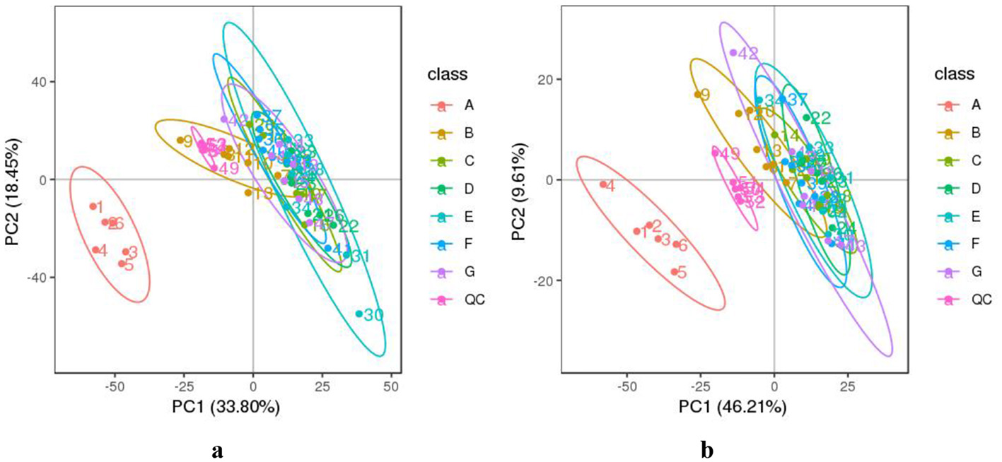 The PCA analysis of DM samples at different lactation stages. (a) The negative and (b) positive ion mode. The horizontal axis PC1 and vertical axis PC2 represent the scores of the principal components ranked first and second, respectively. Different colored dots represent samples from different groups. Ellipses represent a 95% confidence interval. QC, quality control. The milk samples were taken from six lactating donkeys at seven different lactation stages (DIM): 1 (A), 30 (B), 60 (C), 90 (D), 120 (E), 150 (F), and 180 (G).
