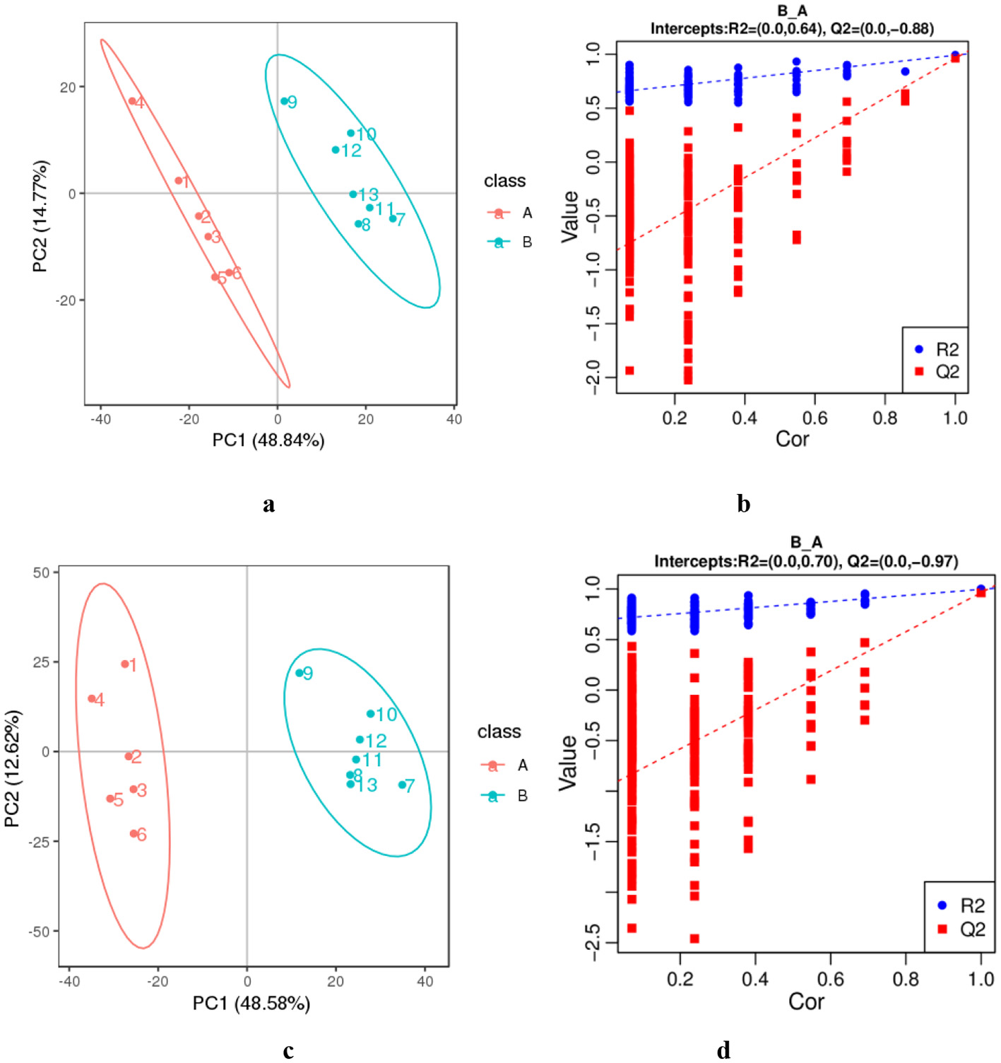 The PCA (a, c) and PLS-DA (b, d) of lipids from colostrum (A) and mature milk (B). (a, b) The negative ion mode. (c, d) The positive ion mode. The horizontal axis PC1 and vertical axis PC2 represent the scores of the principal components ranked first and second, respectively. Ellipses represent a 95% confidence interval. The horizontal axis in the validation plots chart represents the correlation between the random group Y and the original group Y, while the vertical axis represents the scores of R2 and Q2.