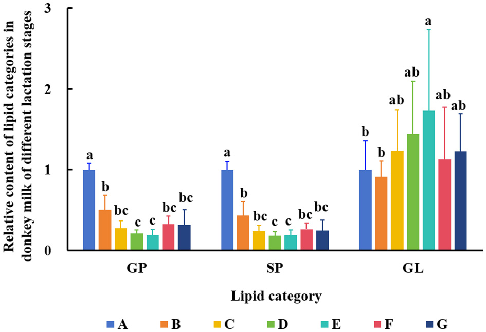 Changes of GP, SP, and GL in DM among different lactation stages. The milk samples were taken from six lactating donkeys at seven different lactation stages (DIM): 1 (A), 30 (B), 60 (C), 90 (D), 120 (E), 150 (F), and 180 (G). The significant differences (P < 0.05) were represented in lowercase letters.