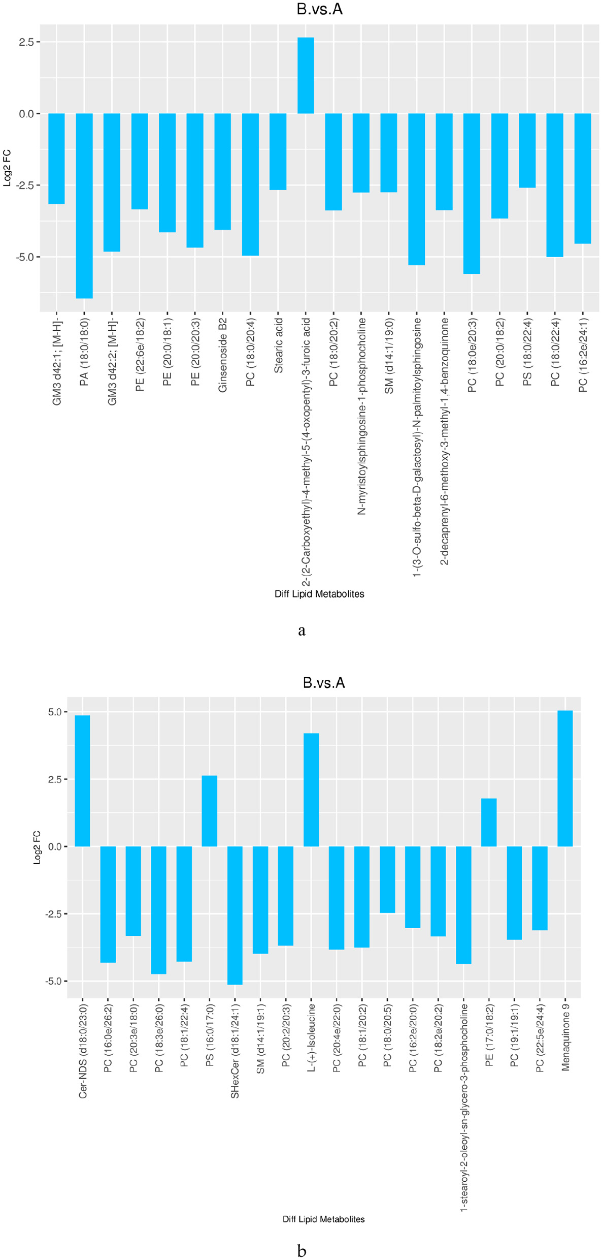 The numbers of differential lipids in DM from different lactation periods are displayed in Table 1 (VIP > 1 and P < 0.05). The comparison between mature milk and colostrum (B vs. A) revealed 964 differential compounds, comprising 432 up-regulated and 532 down-regulated lipids. Among the up-regulated lipids, the main categories were 67 types of GPs, 26 types of SPs, and 16 types of GLs. The down-regulated lipids included 248 types of GPs, 135 types of SPs, 11 types of FAs, and 16 types of GLs. Figure 5 shows the top 20 differential lipids in both positive and negative ion modes between mature milk and colostrum, with six lipids increased and 34 lipids decreased.