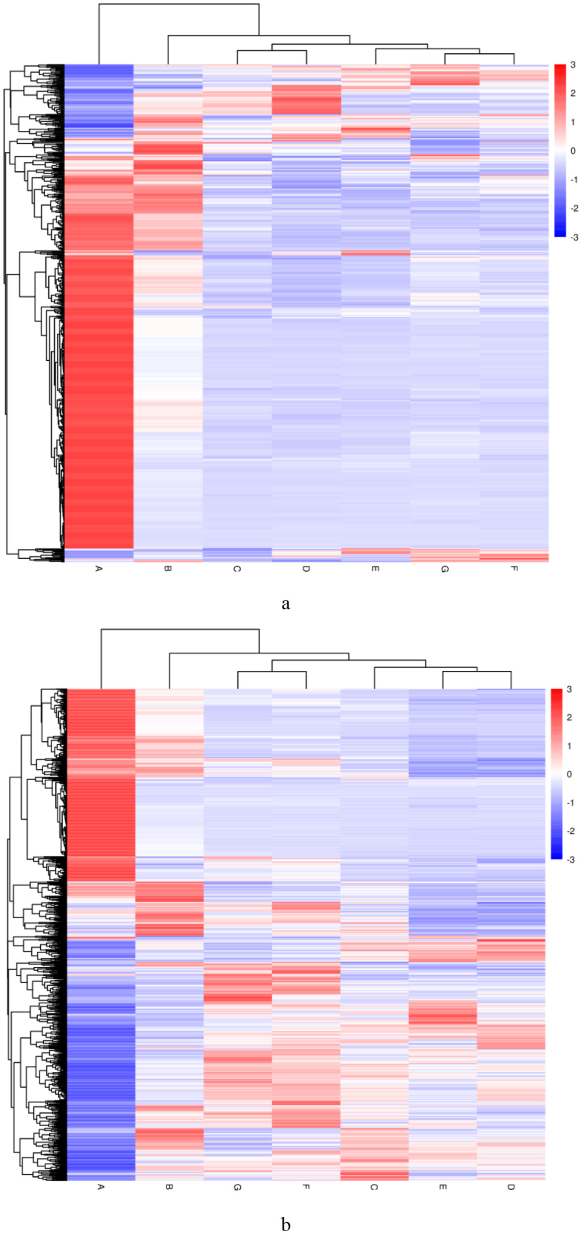 Differential lipid clustering heatmap of DM at different lactation periods. (a) The negative and (b) positive ion mode. Vertical clustering refers to the clustering of samples, while horizontal clustering refers to the clustering of lipids. The shorter the clustering branch, the higher the similarity. The milk samples were taken from six lactating donkeys at seven different lactation stages (DIM): 1 (A), 30 (B), 60 (C), 90 (D), 120 (E), 150 (F), and 180 (G).