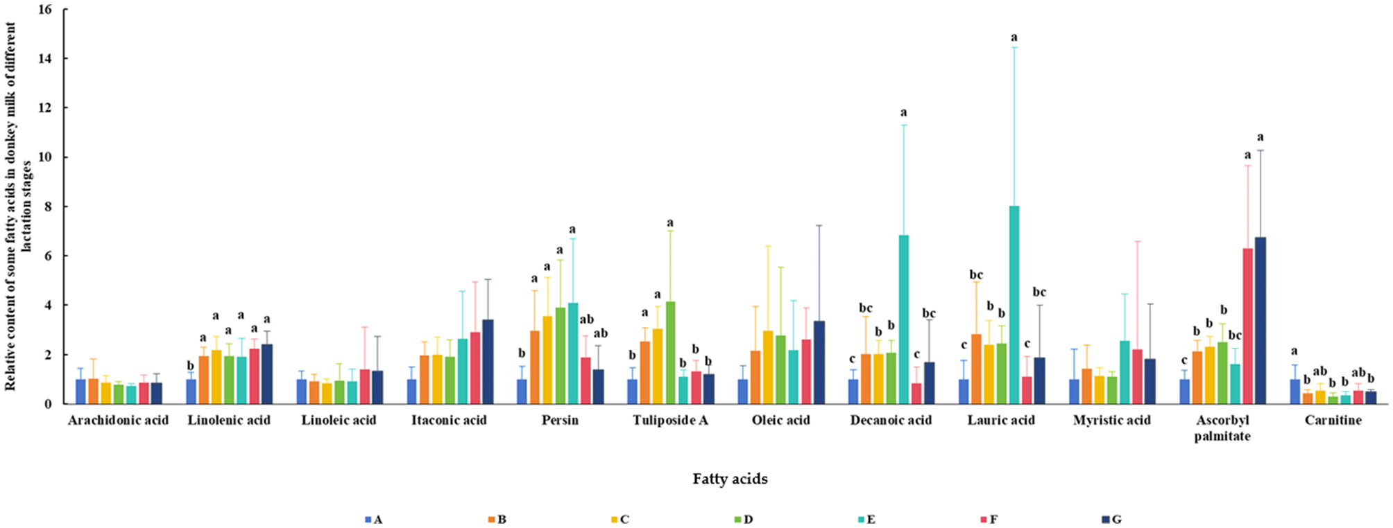 Relative content of some fatty acids in DM of different lactation periods. The milk samples were taken from six lactating donkeys at seven different lactation stages (DIM): 1 (A), 30 (B), 60 (C), 90 (D), 120 (E), 150 (F), and 180 (G). The significant differences (P < 0.05) were represented in lowercase letters.