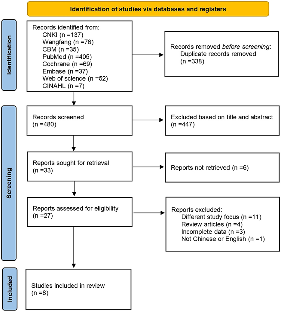 We used the literature management software EndNote X9. Two researchers independently screened and cross-checked the literature according to the inclusion and exclusion criteria. Read the titles and abstracts to exclude irrelevant literature, and then obtain further full text for detailed independent screening. If there were disagreements, they would be negotiated and resolved through a third researcher. We screened the literature using the PRISMA 2020 literature screening process (29).