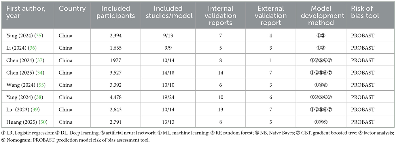 The SRs included in this study all involved retrospective and prospective studies. The first authors of the SRs are all from China. The included SRs synthesized literature published from 2013 to 2024. Each SR included 9–19 literature studies, with a total of 94 literature studies. The sample size ranged from 1,635 to 4,478 individuals, and the study population consisted of patients from comprehensive ICUs, neurologic ICUs, emergency ICUs, geriatric ICUs, those with severe pancreatitis, and those with sepsis. The number of prediction models ranged from 9 to 24, totaling 115. Most models used logistic regression, while others used machine learning approaches. More than half of these prediction models were internally validated (71/115 = 61.7%), and only (36/115 = 31.3%) were externally validated. All SRs used the prediction model risk of bias assessment tool (PROBAST) to evaluate the risk of bias in the prediction models. Table 1 summarizes the characteristics of the included studies.