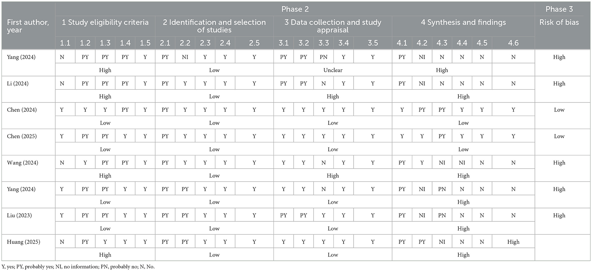 Although AMSTAR 2 (A Measurement Tool to Assess Systematic Reviews tool of Version 2) is rigorously formulated, widely used, and actionable, its scope of adaptation does not include diagnostic test systematic reviews, network Meta-analyses, single-case data meta-analyses, and profile evaluations (45, 46). This study used the ROBIS tool (30, 47), which can assess the risk of bias for various SRs, including interventional, diagnostic, etiologic, prognostic, and others.