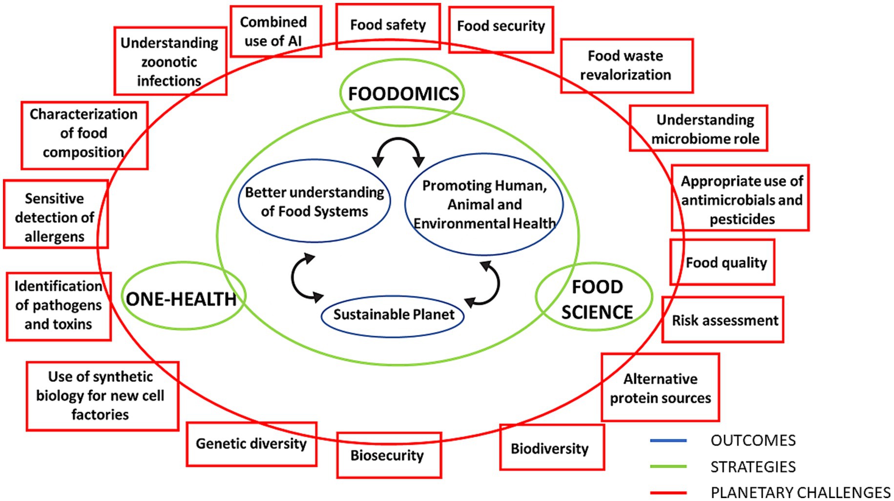 Figure 1. Planetary challenges, strategy proposed in this work combining One Health-Food Science-Foodomics, and expected outcomes.