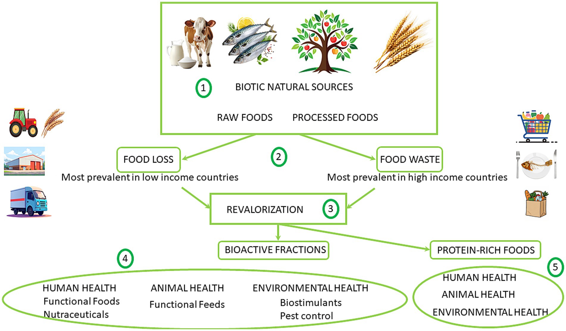 Among the multiple possibilities for advancing One-Health implementation via Food Science, the following roadmap is proposed (see Figure 2): 1) biotic natural sources (vegetal, animal) are employed as foods either raw (after farming, breeding, harvesting or fishing) or after processing; 2) food loss and food waste both represent a reduction in the quantity and/or quality of edible food, but they occur at different stages of the food supply chain. Food loss typically happens during production, harvest, postharvest, storage and transportation. Food waste occurs during distribution and consumption, either at retail, food service, or household levels, and often involves discarding perfectly edible food. Food loss is most prevalent in lower income countries when food is, for example, unintentionally damaged or destroyed by pests or mold. Food waste results from decisions and actions by retailers, food service providers and consumers; it happens most often in high-income countries at restaurants, hotels and homes; 3) valorizing these food loss and food wastes can improve the sustainability of our food systems, including the resources needed to produce the food (water, land, energy, labor, capital); moreover, it can help improving environmental health since disposal of food loss and waste in landfills lead, among others, to greenhouse emissions, contributing to climate change; 4) one way of revalorizing is through the production of bioactive fractions with beneficial effects on human health (elaborating functional foods and/or nutraceuticals with therapeutic potential), animal health (for producing functional feed with antiparasitic activities or to improve health status), environmental health (for biostimulant, pest control, etc.); 5) another way of revalorizing these wastes or wastes’ residues is through its use (after proper processing) as protein-rich foods that can also provide benefits for human health (a better and more straightforward access to proteins), animal health (for animals’ growing, for instance for insects’ cultivation) and environmental health (including the reduction on agriculture intensification for cattle/poultry raising and the associated decrease on greenhouse emissions).