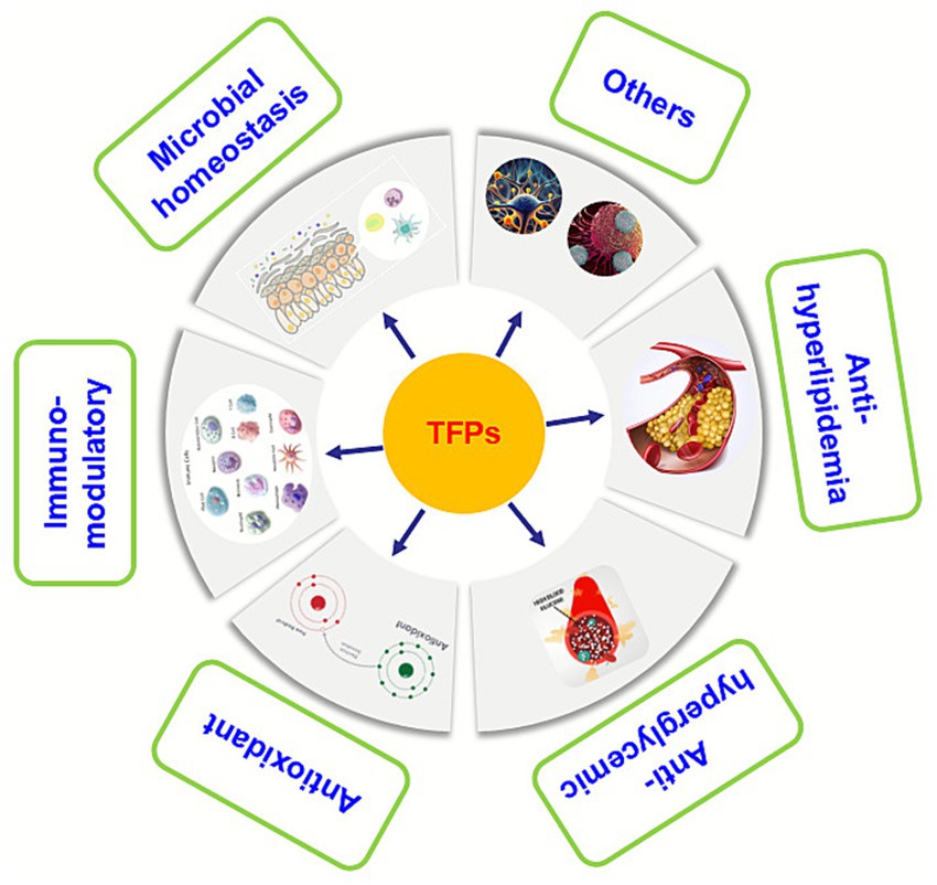 Recently, numerous in vitro and in vivo studies have been conducted to explore the various biological activity and mechanism of action of TFPs, including microbial homeostasis, immuno-modulatory, antioxidant, anti-hyperglycemic, anti-hyperlipidemia, and others (Figure 2). These biological activities and health benefits of TFPs will be discussed one by one in the following paragraphs.