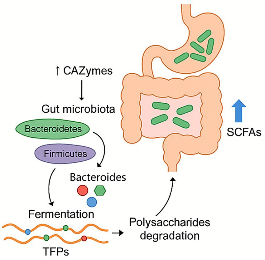 Figure 3. Regulation effect of TFPs on microbial homeostasis. TFPs are fermented by gut microbiota, particularly Bacteroidetes, which degrade them using CAZymes. This process promotes the proliferation of beneficial bacteria and leads to the production of SCFAs, thereby modulating the overall composition of the gut microbiome.