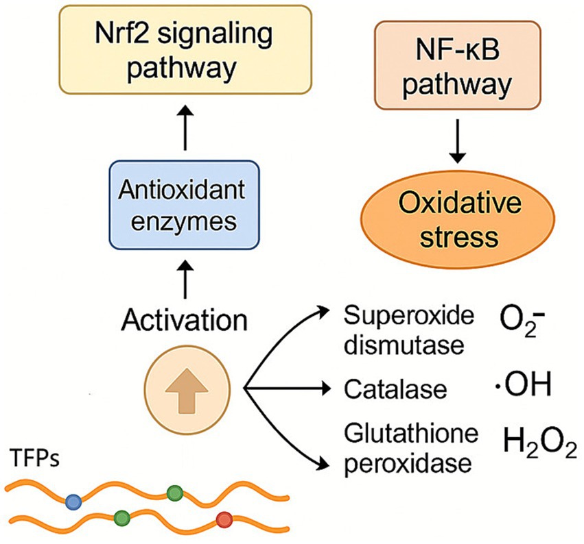 TFPs have demonstrated significant antioxidant regulatory functions through multiple mechanisms (Figure 5). TFPs enhance the activity of key antioxidant enzymes, including superoxide dismutase, catalase, and glutathione peroxidase, boosting cellular resistance to oxidative stress (6). They also activate the nuclear factor erythroid 2-related factor 2 signaling pathway, promoting the expression of downstream antioxidant enzymes, while suppressing oxidative stress-induced inflammation via inhibition of the nuclear factor kappa B pathway. TFPs also effectively scavenge ROS, such as superoxide anions (O₂−·), hydroxyl radicals (·OH), and hydrogen peroxide (H₂O₂), reducing oxidative damage (7, 8). Low molecular weight TFPs demonstrated strong hydroxyl radical scavenging activity, indicating that reducing molecular weight may enhance their overall antioxidant potential. These multifaceted mechanisms suggest that TFPs hold potential for preventing and treating oxidative stress-related diseases, such as neurodegenerative disorders, cardiovascular diseases, and diabetes. However, further research is needed to elucidate their precise molecular targets and dose–response relationships.