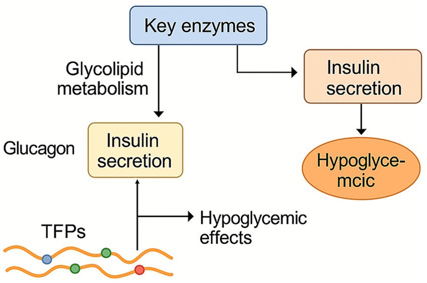 Figure 6. Regulation effect of TFPs on lipid metabolism, blood glucose, and insulin resistance. TFPs alleviate hyperglycemia by stimulating insulin secretion and enhancing hepatic glucose metabolism. Concurrently, they reduce lipid accumulation by suppressing the expression and activity of key lipogenic enzymes.