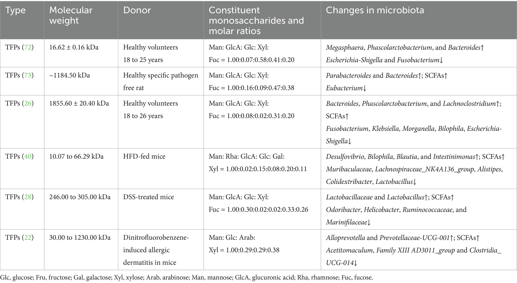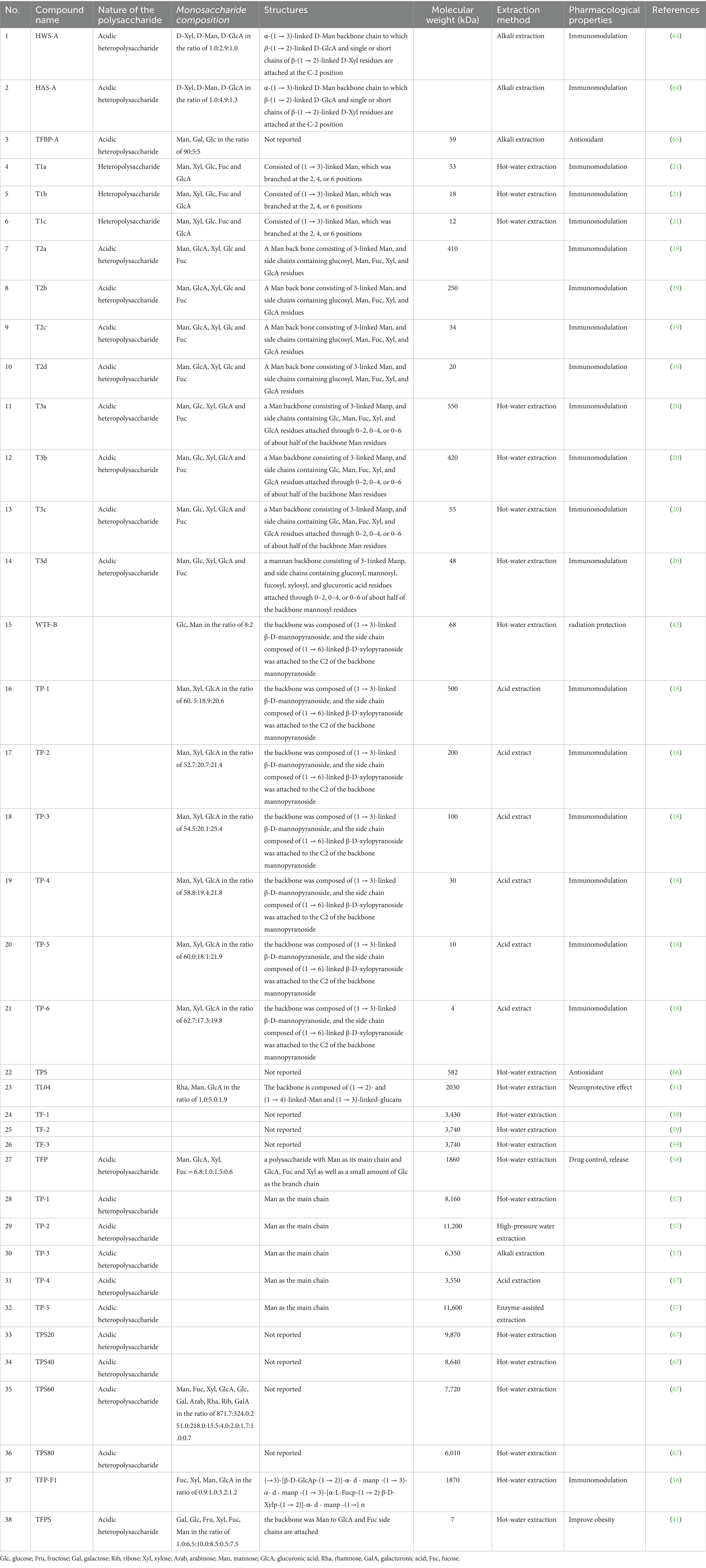 Polysaccharides with diverse biological activities exhibit substantial variation in their chemical composition, conformation, and physicochemical properties. However, elucidating the structure–activity relationships of TFPs remains challenging due to limited research. Nonetheless, several correlations have been reported.