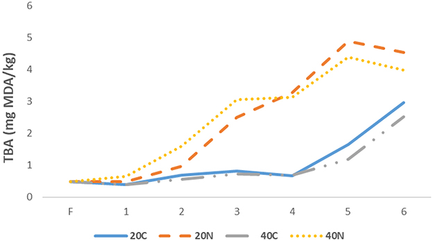 Figure 1. Changes in TBA values during storage among groups 20C: group coated with pure water frozen at −20 °C, 20N: group coated with nanoemulsion frozen at −20 °C, 40C: group coated with pure water frozen at −40 °C, 40N: group coated with nanoemulsion frozen at −40 °C, F: Fresh sample.