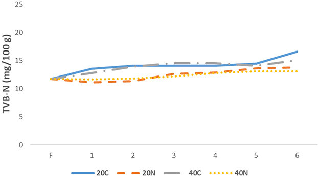 Figure 2. Changes in TVB-N level during storage among groups 20C: group coated with pure water frozen at −20 °C, 20N: group coated with nanoemulsion frozen at −20 °C, 40C: group coated with pure water frozen at −40 °C, 40N: group coated with nanoemulsion frozen at −40 °C, F: Fresh sample.