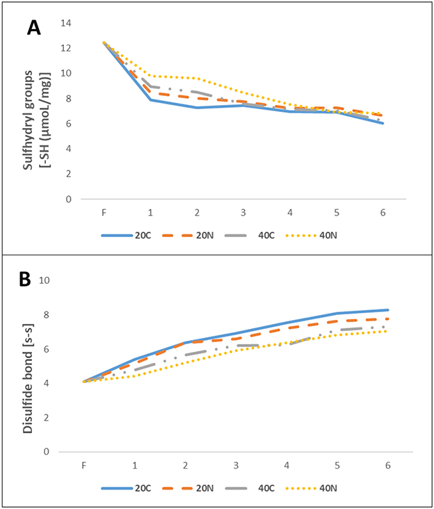 Figure 3. Changes in sulfhydryl group (A) and disulfide bond (B) values during storage among groups 20C: group coated with pure water frozen at −20 °C, 20N: group coated with nanoemulsion frozen at −20 °C, 40C: group coated with pure water frozen at −40 °C, 40N: group coated with nanoemulsion frozen at −40 °C, F: Fresh sample.