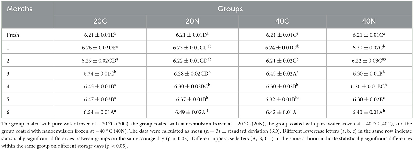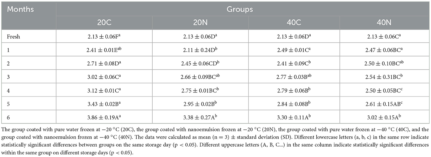 The changes in the pH values of the groups during the storage period are shown in Table 1. At the beginning of the present study, the pH value of fresh rainbow trout was measured at 6.21. During the 6-month storage period, statistically significant differences were observed in the pH values of both control and nanoemulsion-coated filets stored at −20 °C and −40 °C (p < 0.05). An increase in pH values was noted in both the control and nanoemulsion-coated groups throughout the storage period. The breakdown of protein structures due to microbial growth during storage leads to the formation of alkaline compounds, such as ammonia and amines, which contribute to the rise in pH of the product (30–32, 35). The pH value is an important freshness indicator for fish meat, typically to ranging between 6.5 and 7.0 (33). In the control and nanoemulsion-coated groups, this value was found to be 6.40 (at −40 °C) and 6.54 (at −20 °C) in the last month of storage. Based on the obtained data, none of the groups exceeded the specified freshness criteria. Additionally, the pH values of the nanoemulsion-coated filets were lower than those of the control groups. It is believed that the nanoemulsions containing hemp seed oil and aloe vera gel inhibited microbial growth, thus delaying the formation of volatile compounds. These findings align with previous literature. Yazgan (20) stated that nanoemulsion application resulted in a lower pH in fish meat. Yuvka (34) studied the changes in the pH value of rainbow trout filets stored in ice and treated with nanoemusions containing rosemary and oregano essential oils. Similarly to our study, Yuvka's (34) results showed that the pH gradually increased in the control group during storage, while fluctuations in pH were observed in the nanoemulsion-treated groups. A study focused on preserving the quality of aquatic products found that chitosan-based cinnamon-perilla essential oil, anthocyanidin, and collagen-enriched nanoemulsion films effectively extended the shelf life of aquatic products (35). It was also reported that pH values consistently increased during storage, with statistically significant differences observed between the nanoemulsion-treated groups and the control group.