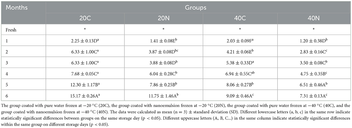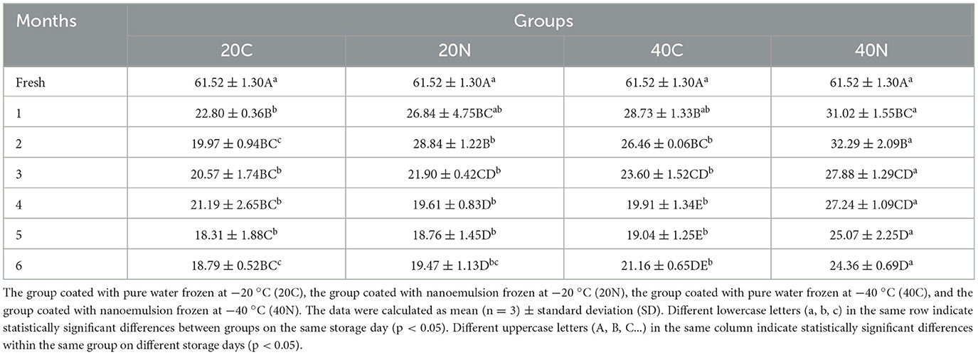 Changes in drip loss are presented in Table 2. Freezing is a commonly employed preservation method for perishable food products, particularly seafood. At temperatures below −10 °C, the growth of most spoilage and pathogenic microorganisms is effectively inhibited, making freezing a highly efficient method for extending shelf life and ensuring food safety. The results of this study indicated that samples frozen at −20 °C exhibited higher drip loss compared to those frozen at −40 °C. This is attributed to the rapid freezing process at −40 °C, which leads to the formation of smaller ice crystals, thereby minimizing tissue damage (36). A statistically significant difference in drip loss was observed both between groups and over storage months (p < 0.05). In the groups frozen at −20 °C, drip loss in the first month was 2.25% for the 20C group and 1.41% for the 20N group. By the final month, these values increased to 15.17% and 11.75%, respectively. For the rapid freezing method (−40 °C), first-month drip loss was 2.03% for the 40C group and 1.20% for the 40N group, rising to 9.09% and 7.31% by the final month. Previous studies supported these findings. Abbas et al. (37) reported that carp filets treated with essential oils (black seed, grape seed, and jojoba) and natural additives like chitosan exhibited lower drip loss compared to control filets during frozen storage. Similarly, nanoemulsions containing antioxidants derived from bamboo leaves, rosmarinic acid, and sodium lactate improved water-holding capacity in tuna, although a gradual decrease was observed during storage (38, 39). Sharifimehr et al. (40) developed edible coatings based on nanoemulsions containing varying concentrations of aloe vera gel powder and eugenol, finding that higher aloe vera concentrations significantly reduced drip loss in pink shrimp during refrigerated storage. In line with these findings, the reduction in drip loss observed in the nanoemulsion-treated groups compared to the control groups at both −20 and −40 °C in the present study indicates that hemp seed oil and aloe vera gel positively contributed to minimizing drip loss.