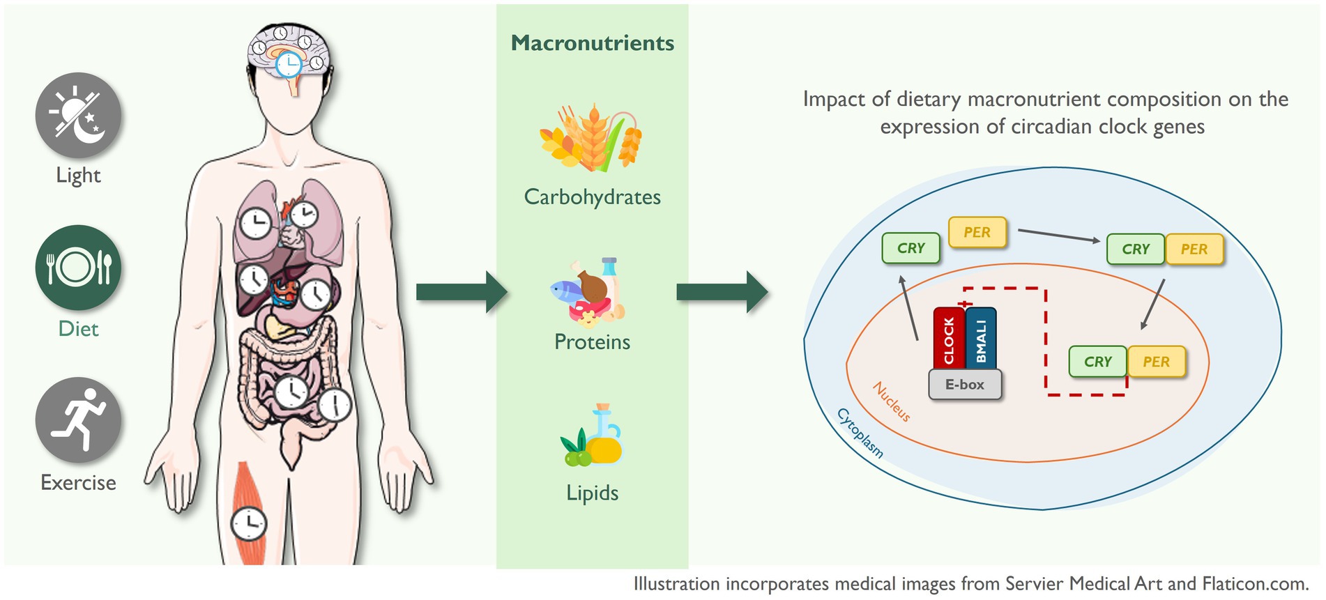 While much attention has been given to the timing of food intake, evidence regarding the impact of diet composition on circadian clock gene expression remains limited. However, findings from animal studies suggest that specific macronutrient profiles can alter the expression and rhythmicity of clock genes in a tissue-specific manner, highlighting the need for further investigation in human models. For example, Hatori et al. (24) showed that mice fed a high-fat diet exhibited a decreased amplitude of expression of most clock genes in the liver. Similarly, Goede et al. (25) showed that a high-fat and high-sugar intake induced tissue-specific alterations in clock gene rhythmicity. In their study, mice given ad libitum access to both diets (referred to as a free-choice high-fat/high-sugar diet) during the light phase exhibited attenuated or phase-shifted clock gene expression in skeletal muscle, while rhythmicity in brown adipose tissue was amplified.