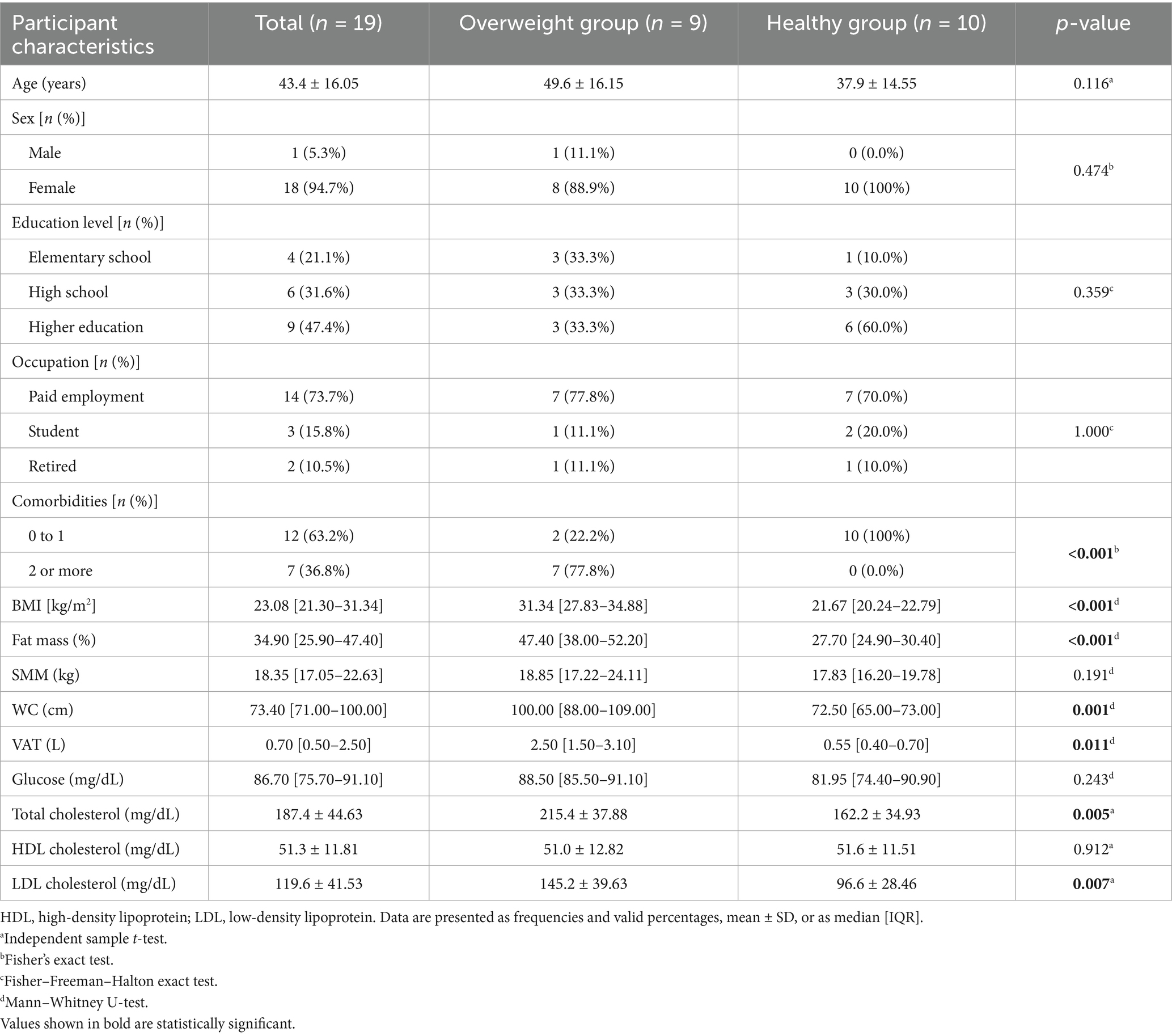 This observational study included 19 participants (94.7% female) with a mean age of 43.4 ± 16.05 years (min: 20 years; max: 69 years). Participants were clustered according to their BMI into the healthy group and the overweight/obesity group. The overweight/obesity group showed significantly more comorbidities (p < 0.001) and higher BMI, fat mass, and visceral adipose tissue (p < 0.01) (Table 1). Lipid profiles also differed significantly, with the overweight/obesity group showing higher total cholesterol, LDL-C, and triglycerides (p < 0.05), but no difference in HDL-C (p = 0.912). No significant differences were found in skeletal muscle mass or waist circumference.