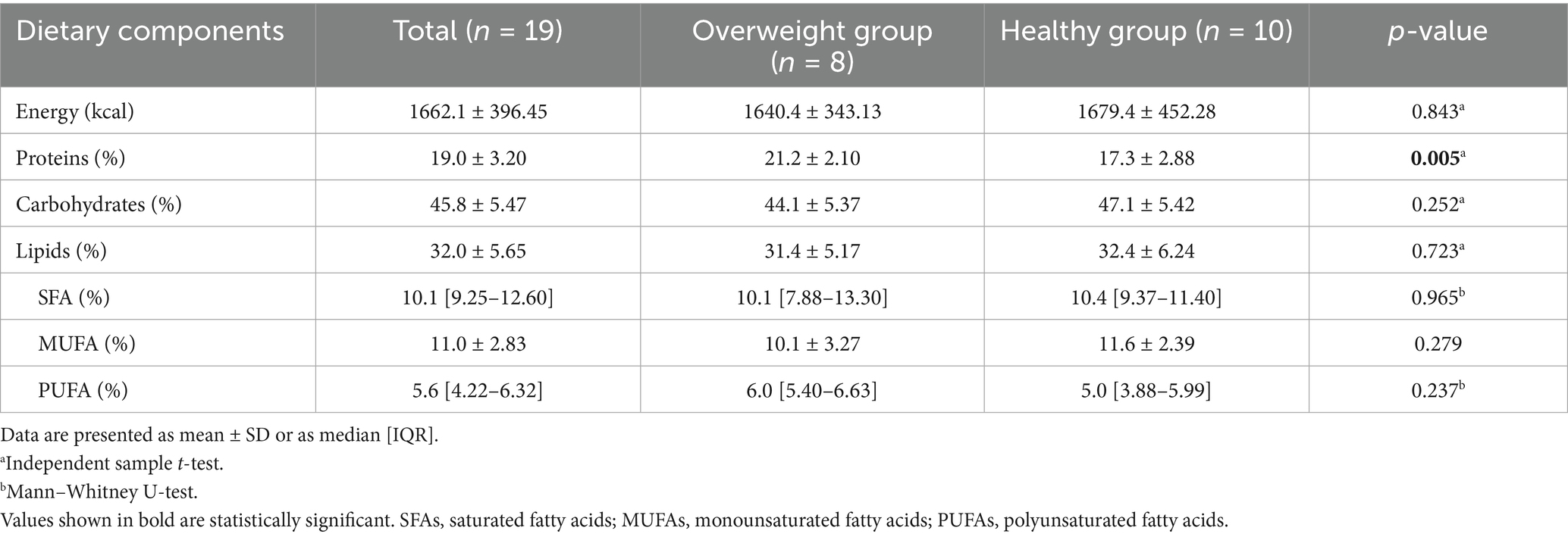Mean energy intake was assessed using the 3-day food diaries and did not significantly vary between the two BMI groups (Table 2). In terms of macronutrient distribution, only the percentage of energy derived from protein significantly differed between groups, being higher in the overweight/obesity group compared to the healthy-weight group.