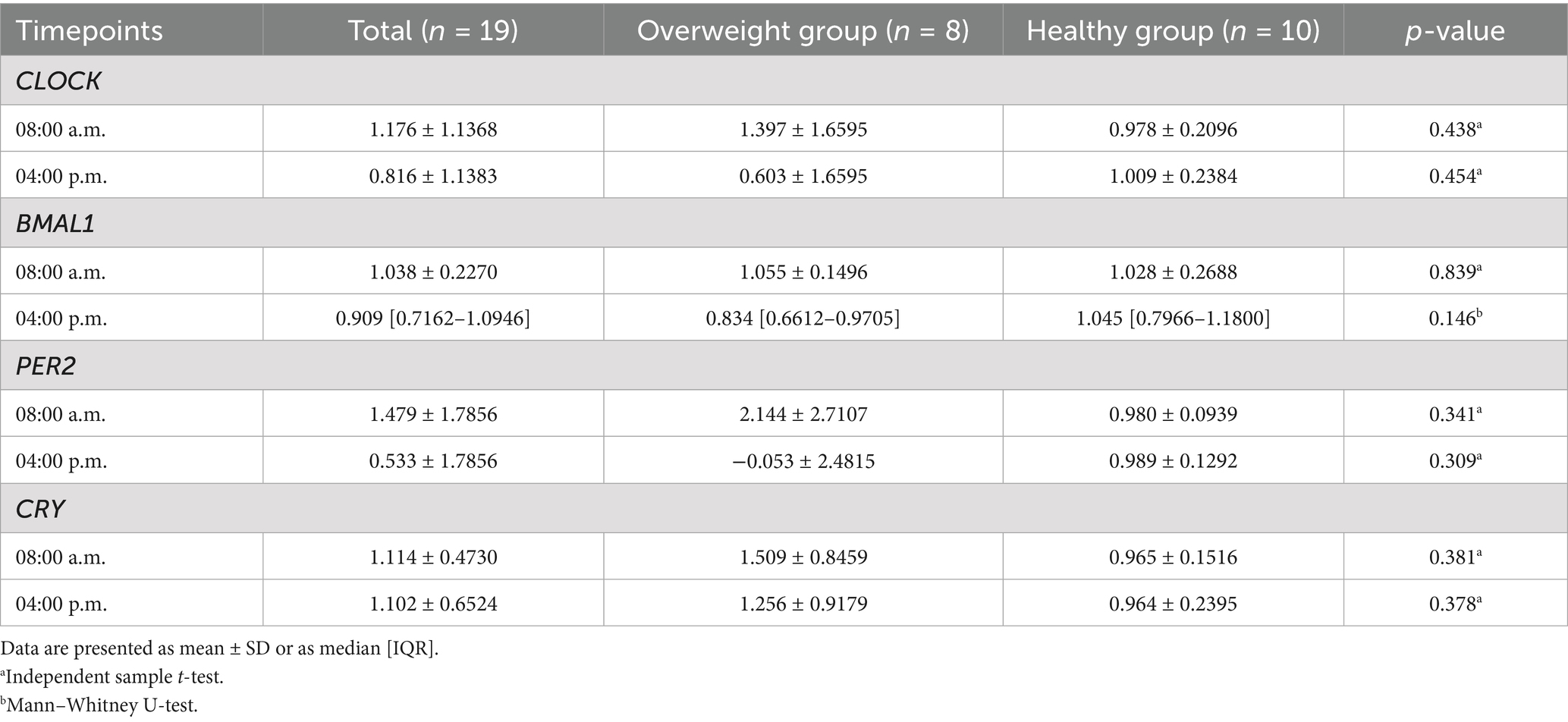 Clock gene expression was assessed in whole blood at two distinct time points, 08:00 a.m. and 04:00 p.m. No statistically significant differences in the expression of CLOCK, BMAL1, PER2, and CRY were observed between the overweight/obesity and healthy BMI groups (Table 3). Although the expression of PER2 and CRY at 08:00 a.m. was numerically higher in the overweight/obesity group, these differences did not reach statistical significance.