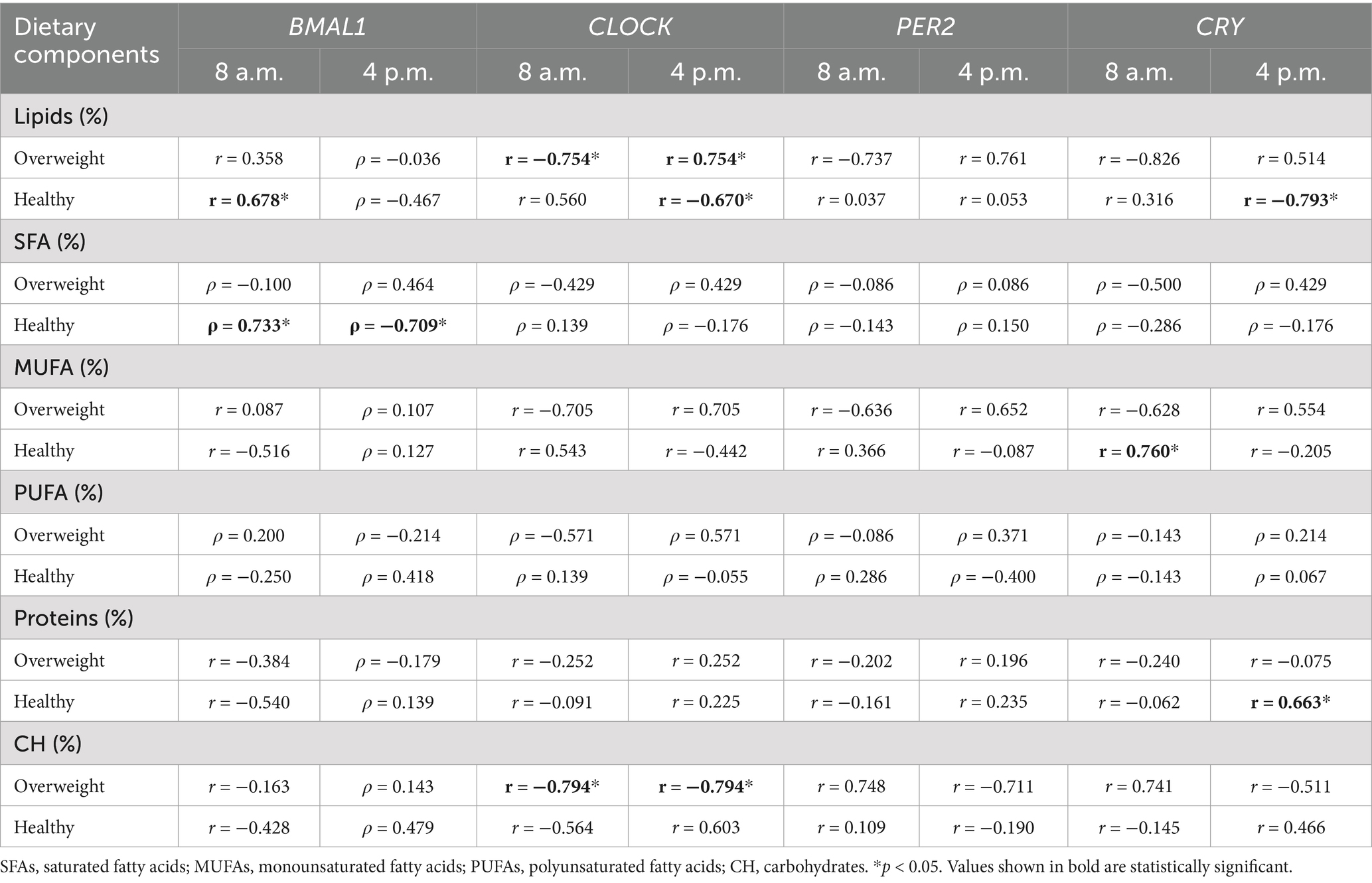 Beyond protein and carbohydrate intake, dietary lipids also appear to play a significant role in circadian regulation. Lipid metabolism and circadian rhythms are closely linked, with growing evidence underscoring their bidirectional influence. Core clock genes, such as CLOCK and BMAL1, regulate lipid synthesis, degradation, and transporter expression (46–48). In our study, the healthy BMI group showed significant associations between BMAL1 expression and the percentage of total lipid intake at 08:00 a.m., as well as with the percentage of SFA intake at both 08:00 a.m. and 04:00 p.m. In contrast, no such associations were detected in the overweight/obesity group. This finding may indicate a preserved responsiveness of peripheral clocks to dietary lipid cues in metabolically healthy individuals, potentially supporting circadian alignment between nutrient availability and metabolic gene expression. In contrast, the absence of association in the overweight/obesity group may reflect impaired nutrient sensing or circadian desynchronization, phenomena often linked to metabolic dysfunction.