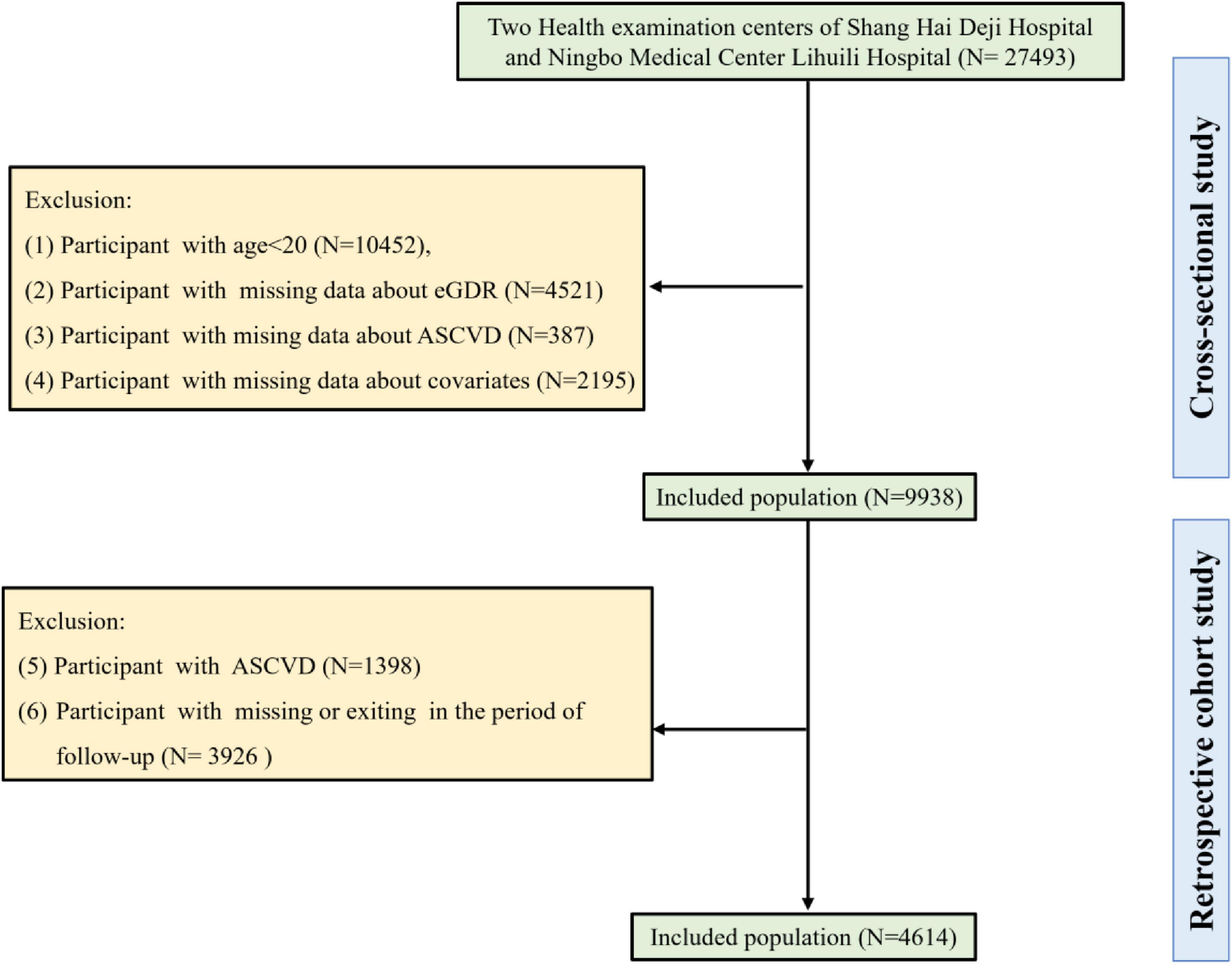Our cross-sectional study initially included 27,493 individuals from two health examination centers of Qingdao University Affiliated Shanghai Deji Hospital and Ningbo Medical Center Lihuili Hospital. According to the exclusion criteria of our cross-sectional study, individuals under 20 years of age (N = 10,452), those with missing eGDR data (N = 4,521), missing ASCVD data (N = 387), and missing covariate information (N = 2,195) were excluded. Finally, 9,938 individuals were included in our cross-sectional study. In addition, 4,614 participants were included in our retrospective cohort study after excluding individuals with ASCVD (N = 1,398), and those with missing or exiting in the period of follow-up (N = 3,926). A detailed flowchart (Figure 1) delineated the participant selection process.