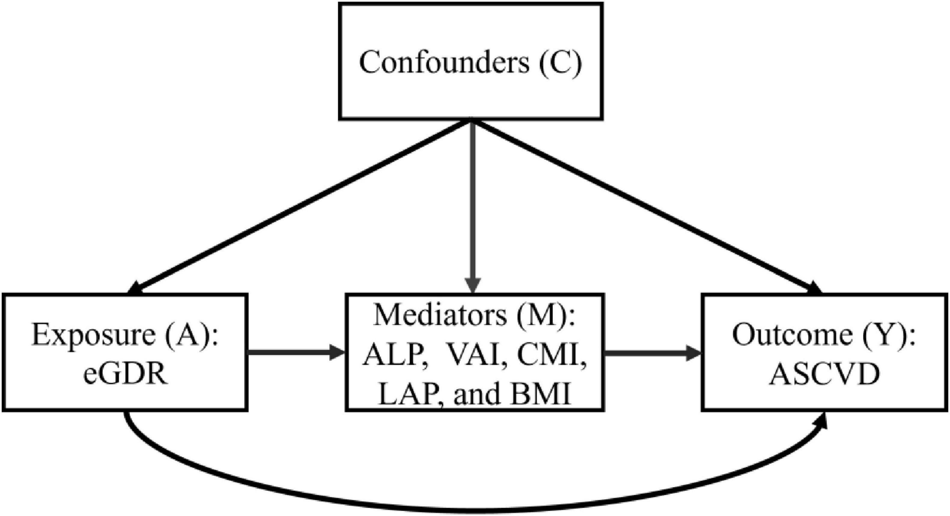 Insulin resistance (IR) represents a fundamental endocrine dysfunction wherein target tissues demonstrate impaired sensitivity to physiological insulin action at both receptor and post-receptor levels, constituting a core metabolic disorder in numerous chronic diseases (7, 8). This metabolic disorder is primarily manifested through impaired glucose homeostasis, particularly in skeletal muscle and adipose tissue, resulting from defective insulin-stimulated glucose uptake and utilization (9, 10). The progression of IR has been shown to involve multifactorial etiology, with genetic predisposition and environmental determinants synergistically contributing to its pathogenesis through complex gene-environment interactions (11, 12). The estimated glucose disposal rate (eGDR), calculated by waist circumference and hypertension status, hemoglobin A1c (HbA1c), has emerged as a validated surrogate marker for IR (13, 14). When eGDR levels increased, glucose utilization ability is enhanced, which suggests a low risk of IR. Therefore, eGDR demonstrates significant clinical utility and predictive value in the risk of IR (15, 16). Currently, some evidence has elucidated a significant negative dose-dependent association between high eGDR levels and incident adverse cardiovascular disease, particularly myocardial infarction and ischemic stroke. However, the relationship of eGDR with ASCVD risk remains unclear. In addition, some epidemiological studies have demonstrated that obesity status is linked with both eGDR and ASCVD (17–19). For example, Geng et al. demonstrate that eGDR was negatively associated with WWI, as an obesity related index, in two cohort studies in China and the UK (20). In addition, Makhmudova et al. used UK Biobank data to explore the association between visceral obesity and risk of ASCVD, and their findings reveal that high visceral obesity increased the risk of ASCVD (21). Therefore, based on the above evidence, we speculate that obesity may be a possible mediating factor in the association of eGDR with ASCVD risk. However, no studies have yet investigated the potential mediating effect of obesity in the association of eGDR with ASCVD risk.
