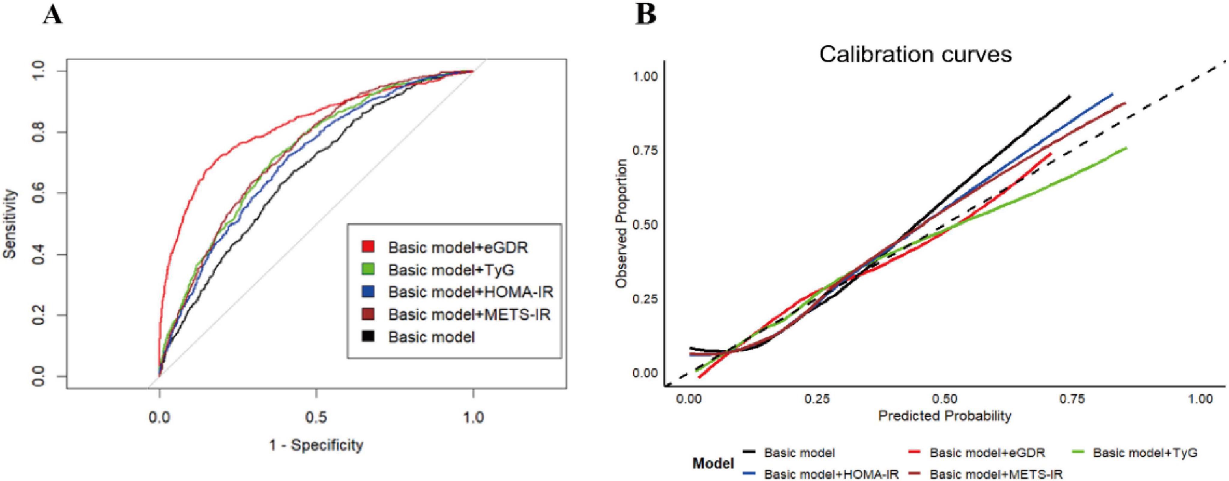 Figure 4. The diagnostic performance of IR-related indicators on the ASCVD diagnosis. The ROC curves (A) and calibration curves (B) for predictive performance of the ASCVD diagnosis. The basic model was adjusted for all covariates, except for WC, hypertension, and HbA1c.