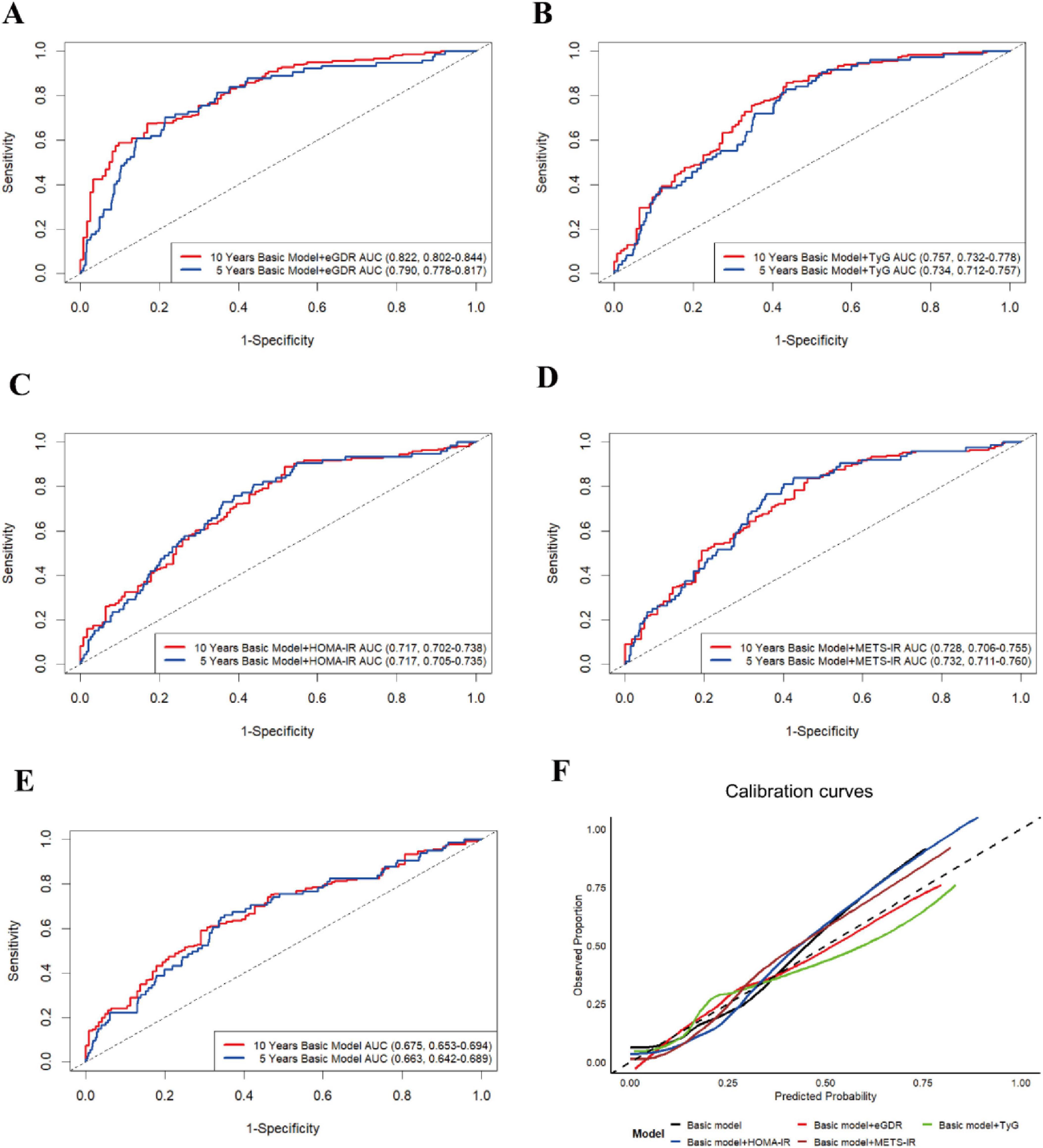 Figure 5. The time-dependent ROC curve (times = 5 and 10 years) for predictive effect of eGDR (A), TyG (B), HOMA-IR (C), METS-IR (D), and basic model (E) on the new-onset ASCVD risk. (F) The calibration curves (10 years) for the predictive performance of the new-onset ASCVD. The basic model was adjusted for all covariates, except for WC, hypertension, and HbA1c.