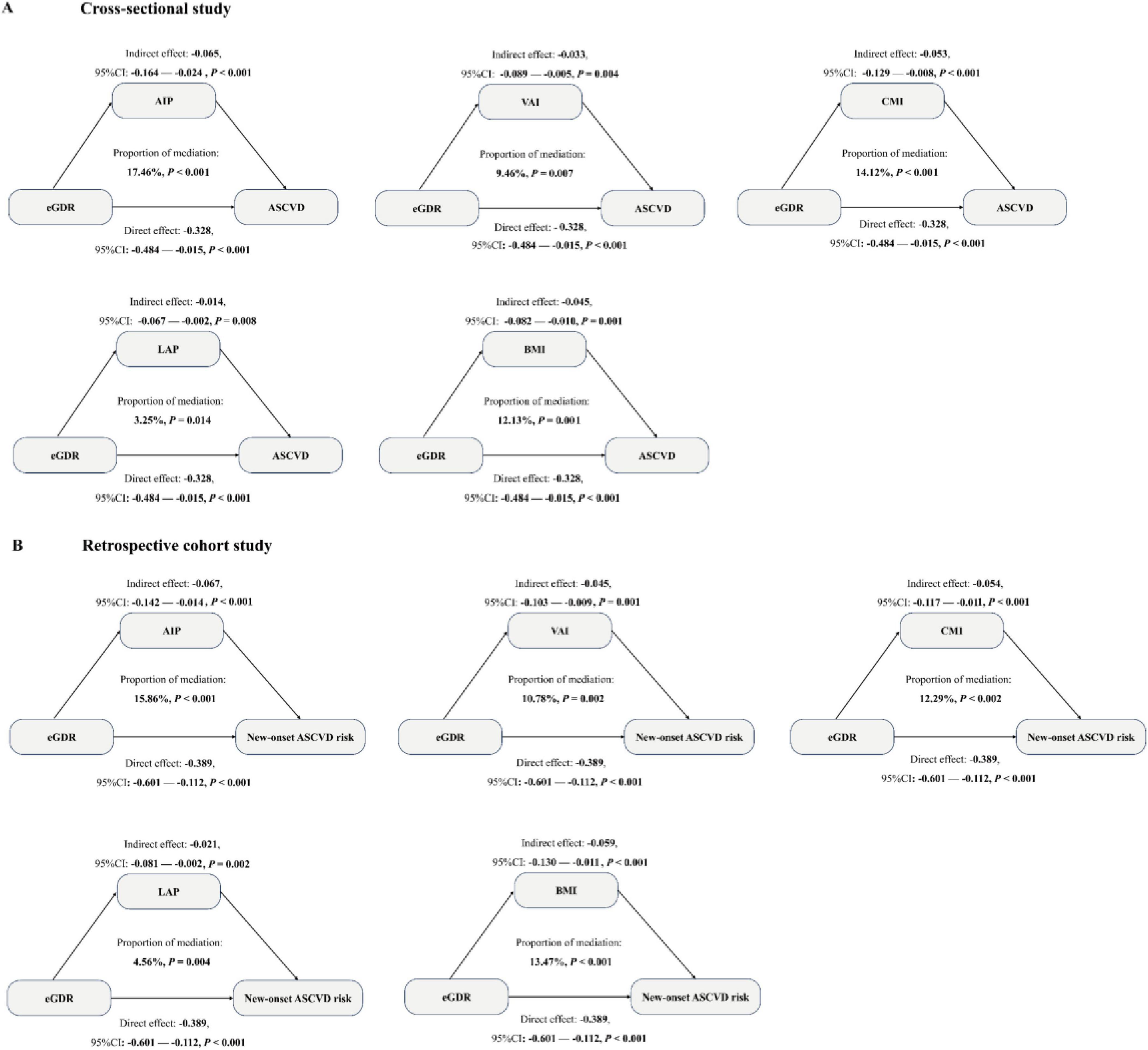 Figure 6. Mediation analysis was used to show the mediation effects of five related obesity indices (AIP, VAI, CMI, LAP, and BMI) in a cross-sectional study (A) and a retrospective cohort study (B). The model was adjusted for all covariates, except for WC, hypertension, and HbA1c.