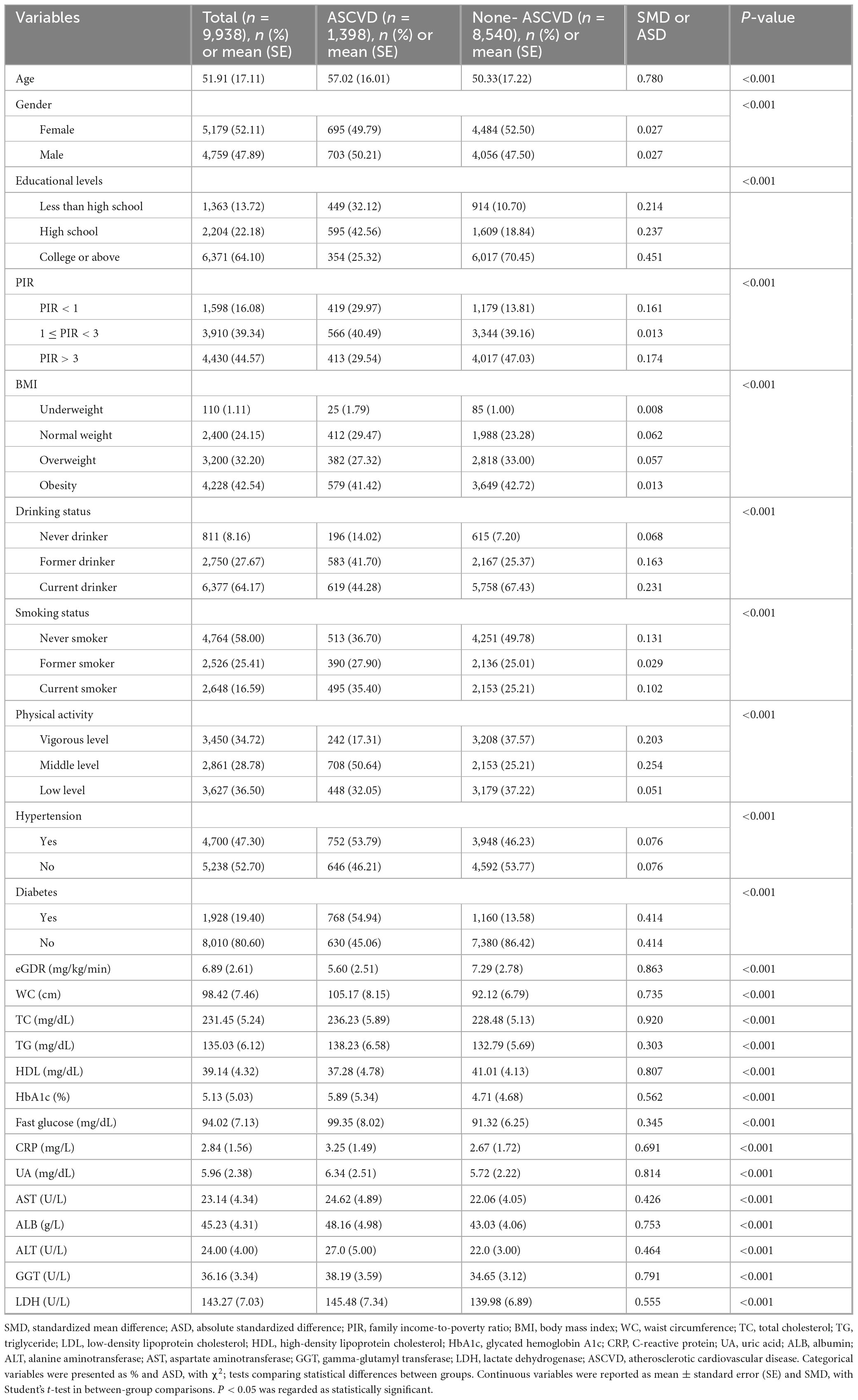 Following the American Heart Association guidelines and established clinical criteria, ASCVD was defined as: participants with physician-diagnosed cardiovascular conditions, including coronary artery disease, angina pectoris, myocardial infarction, cerebrovascular accident, congestive heart failure, and stroke (23).