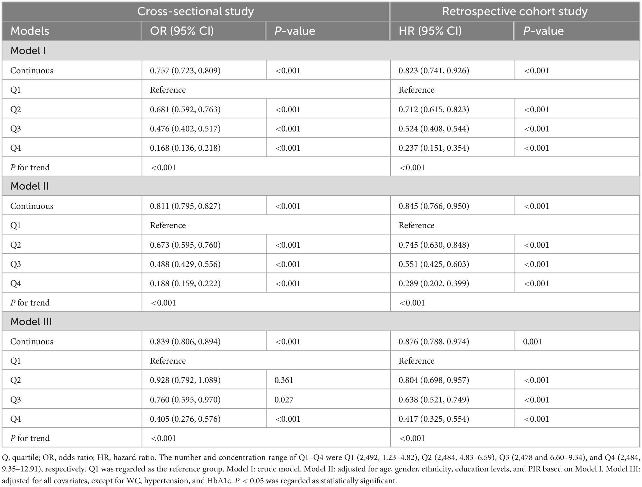 Table 1 and Supplementary Table 1 summarized the baseline characteristics of the participants. As shown in Table 1, this cross-sectional study included 9,938 participants aged ≥ 20 years, among whom 52.11% (n = 5,179) were female, and 14.07% (n = 1,398) met diagnostic criteria for ASCVD. In addition, our retrospective cohort study comprised 4,614 participants, among whom 47.88% (n = 2,209) were female, and 18.80% (n = 868) were new-onset ASCVD (Supplementary Table 1). Significant differences (P < 0.05) were observed across all covariates when comparing participants with ASCVD to those with non-ASCVD in cross-sectional and retrospective cohort studies. In addition, the baseline demographic characteristics of the included and excluded participants were displayed in Supplementary Table 2, and no significant differences (P > 0.05) were observed across most covariates when comparing included participants to those excluded in the retrospective cohort study.