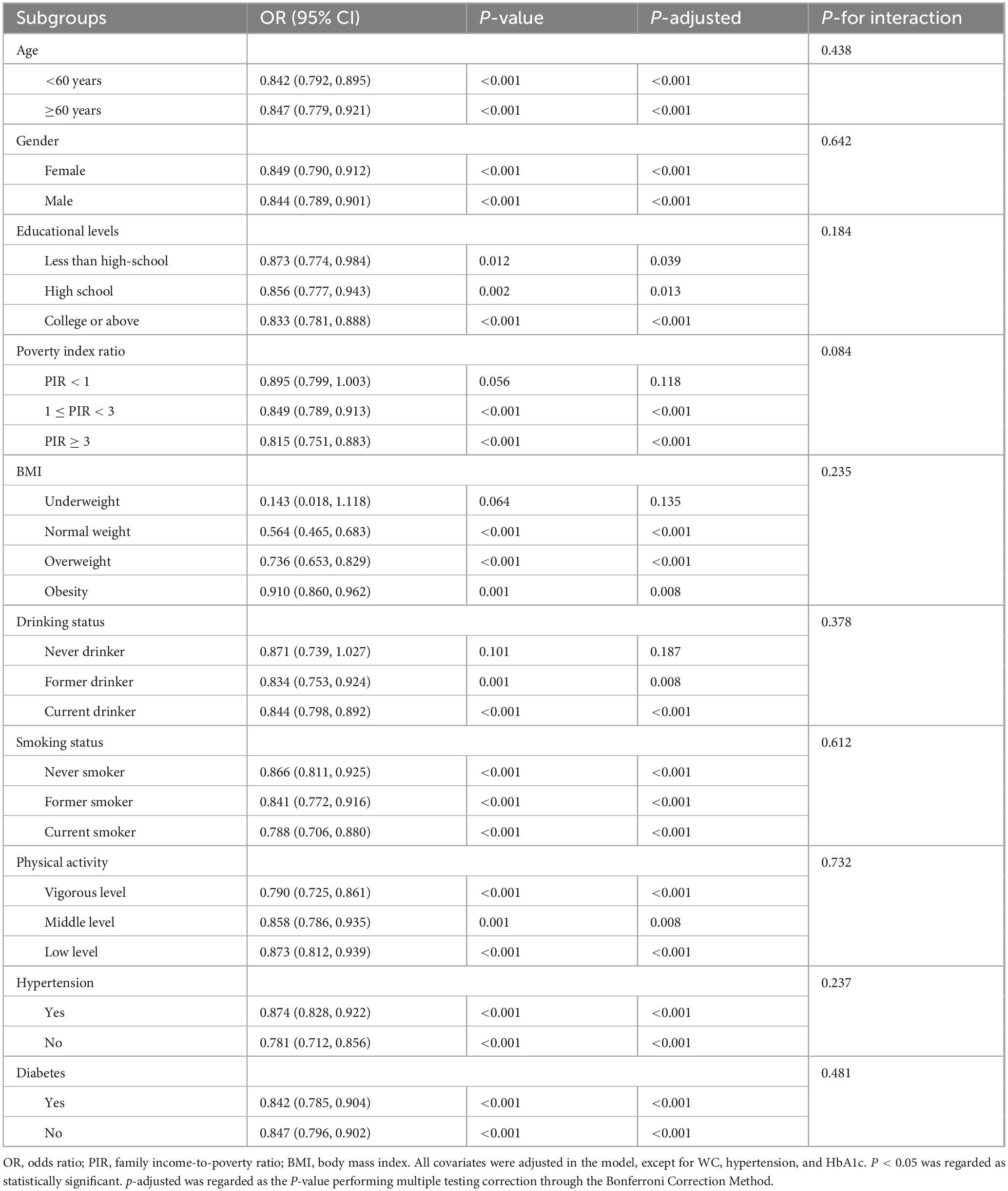 Our study included the following sociodemographic, lifestyle, and clinical biomarker covariates. Sociodemographic and lifestyle covariates included age (<60 years, ≥ 60 years), gender (female and male), education levels (less than high school, high school, more than college), and poverty index ratio (PIR) (< 1.0, 1.0–3.0, and ≥ 3.0), body mass index (BMI) (< 18.5, 18.5–24.9, 25–29.9, ≥ 30 kg/m2), smoking status (never/former/current smoker) and drinking status (never/former/current drinker), physical activity (vigorous/moderate/low level). Current smoker was regarded as participants with a lifetime cumulative smoking of ≥ 100 cigarettes, and were still smoking at the time of the survey. Former smoker was regarded as participants with a lifetime cumulative smoking of ≥ 100 cigarettes, but had quit smoking at the time of the survey. Never smoker was regarded as participants with a lifetime cumulative smoking of ≤ 100 cigarettes (29). Current drinker was determined as participants who have consumed any alcoholic beverage within the past 12 months. Former drinker was determined as participants who previously drank regularly but have abstained from alcohol for more than 12 months. Never drinker was determined as participants with a lifetime alcohol consumption < 12 drinks (30). Vigorous activity refers to engaging in vigorous physical activity at least 3 days per week, accumulating a total of at least 1,500 MET-minutes per week. Moderate activity refers to engaging in at least 30 min of moderate-intensity activity or brisk walking on at least 5 days per week. Low-level activity refers to those who do not meet the standards for “moderate” or “Vigorous” levels (31, 32). Hypertension was defined as participants with three times average systolic blood pressure (SBP) of ≥ 130 and a diastolic blood pressure (DBP) of ≥ 80 mmHg, or diagnosed by a physician, or usage of lower blood pressure medicine, which was categorized into yes or no. Diabetes was defined as participants with fasting glucose ≥ 126 mg/dL or HbA1c ≥ 6.5%, or diagnosis by a physician, or usage of lower blood glucose medicine, which was categorized into yes or no (33, 34). Clinical biomarkers covariates included waist circumference (WC), total cholesterol (TC), triglyceride (TG), low-density lipoprotein cholesterol (LDL), high-density lipoprotein cholesterol (HDL), glycated hemoglobin A1c (HbA1c), fast glucose, C-reactive protein (CRP), uric acid (UA), total cholesterol (TC), albumin (ALB), aspartate aminotransferase (AST), alanine aminotransferase (ALT), gamma-glutamyl transferase (GGT), and lactate dehydrogenase (LDH).