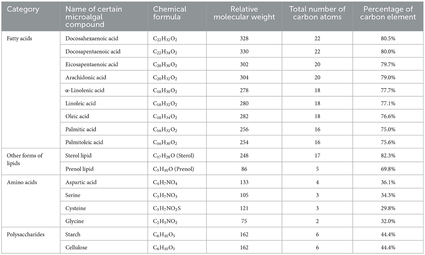 Lipids, particularly fatty acids with a long carbon skeleton, serve as excellent carriers of carbon element, playing a key role in carbon bio-sequestration. Percentage of carbon element in microalgal compounds can be estimated according to the equation as follows: