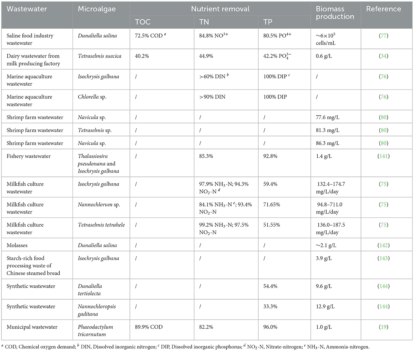 Table 2. Cultivation of marine microalgae in wastewater for nutrient removal and biomass production.