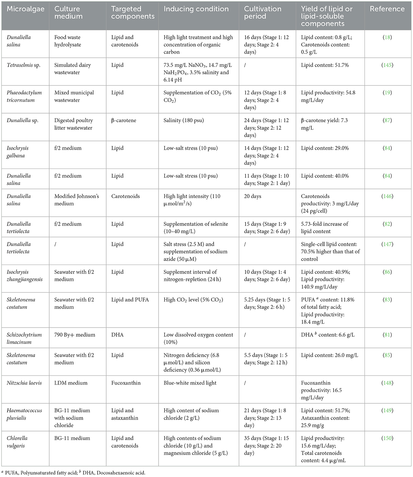 Recent studies primarily focused on exploring the technical advantages of two-stage cultivation over single-stage cultivation, optimizing novel inducing conditions for marine microalgae, and investigating the practical application of two-stage cultivation in real-world production (Table 3). Firstly, previous study compared the applications of single-stage cultivation and two-stage cultivation for lipid production, discovering that with the supplementation of selenite at a density of 20 mg/L, lipid content of Dunaliella tertiolecta in single-stage cultivation increased 2.39-fold while that in tow-stage cultivation increased 5.73-fold (82). The advantage of two-stage cultivation over single-stage cultivation was also reported in the study of growing Skeletonema costatum for PUFA production (83). In the study of Ra et al. (84), the transfer of Dunaliella salina from Stage 1 to Stage 2 resulted in a rapid increase of lipid content (40.0%). It should be noted that dry cell weights of marine microalgae in Stage 2 were not negatively impacted by the inducing conditions (84). These discoveries confirmed that two-stage cultivation model can realize the high accumulation of lipids, PUFA, and lipid-soluble components in marine microalgae without compromising the microalgae biomass production. Secondly, a couple of innovative inducing conditions have been developed to cultivate marine microalgae for lipid and lipid-soluble components production. For example, silicon deficiency was adopted to induce the lipid synthesis in Skeletonema costatum, resulting in an increase of lipid productivity by 113.7% compared with the control group without stress condition (85). Besides, supplement interval of nitrogen-repletion was adjusted to enhance lipid synthesis in Isochrysis zhangjiangensis (86). Thirdly, two-stage cultivation model has progressively transitioned from laboratory research to industrial-scale application. This novel model was implemented in the integrated marine microalgae cultivation and wastewater (food waste hydrolysate, digested poultry litter wastewater, mixed municipal wastewater, etc.) remediation (18, 19, 87). It was discovered that compared with the lipid productivity of marine microalgae in Stage 1, that of marine microalgae in Stage 2 was improved dramatically, reaching 54.8 mg/L/day (19). These achievements confirmed the practical feasibility of employing marine microalgae to produce lipid by two-stage cultivation model in the industry.