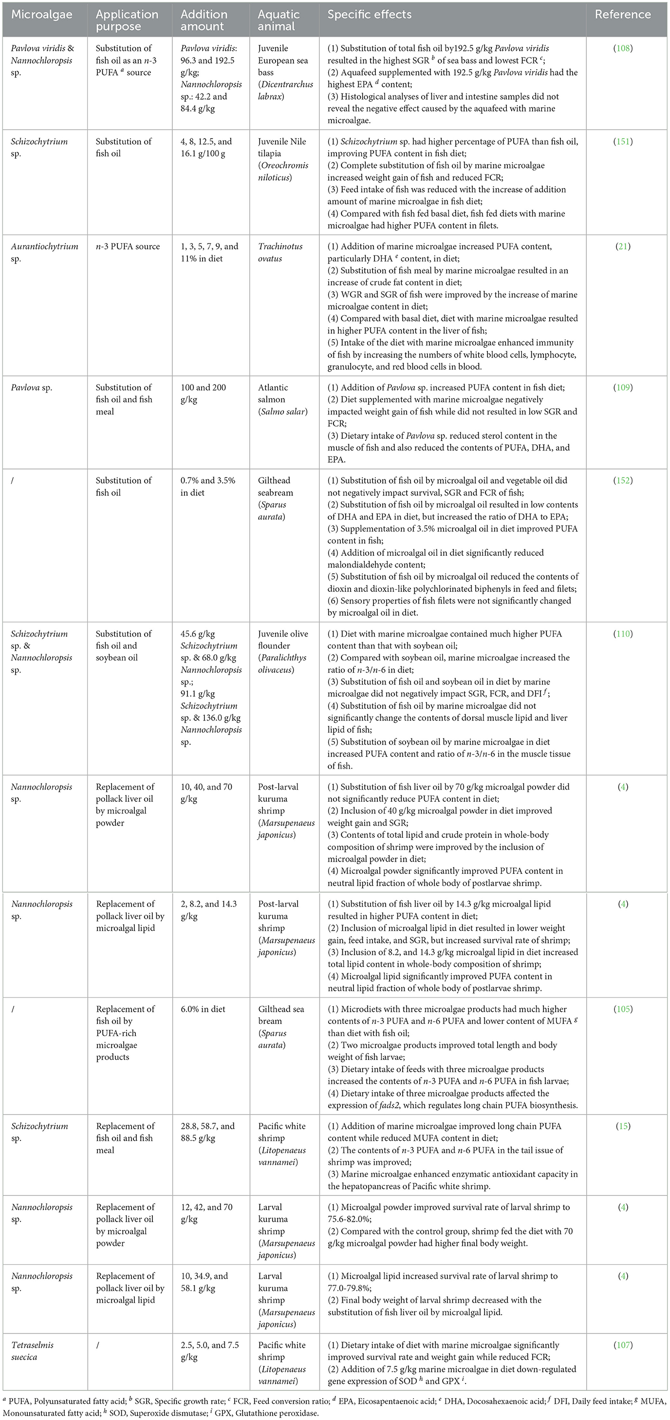 Marine microalgae can be added into aquafeed in the form of extracted lipid, biomass powder, or commercial bio-product to substitute fish oil or vegetable oil (Table 4). For example, lipid was extracted from Nannochloropsis sp. and then added in aquafeed to replace pollack liver oil (4). However, in the practical application, extraction process not only leads to lipid loss, but also increases the overall cost of aquafeed production. In most cases, therefore, marine microalgae are added into aquafeed in the form of biomass powder. Normally, omniferous and herbivorous fish could efficiently digest microalgae-based diet and absorb nutrients from microalgae. However, it should also be noted that cellulose, pectin, and other compounds with low digestibility in microalgae biomass may negatively impact the digestive metabolism of carnivorous fish and increase feed conversion ratio (FCR). Recently, with the commercial value of microalgae being increasingly explored, lipid-rich microalgae bio-products are being developed and utilized as an oil source in aquafeed. Three commercial bio-products, ALL G RICH, DHA GOLD, and MO060, made in USA, Switzerland, and France, respectively, were employed to completely replace sardine oil in the diet of gilthead sea bream (105).