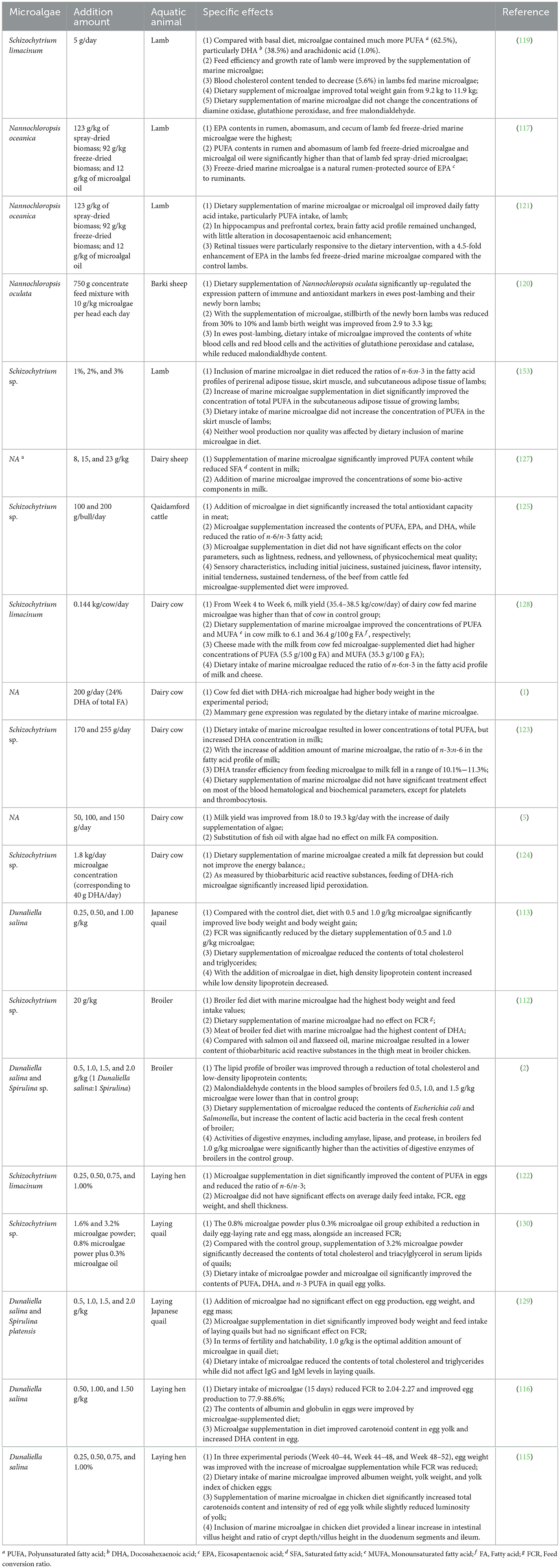 Table 5. Application of marine microalgal lipid as feed ingredient for livestock and poultry farming.