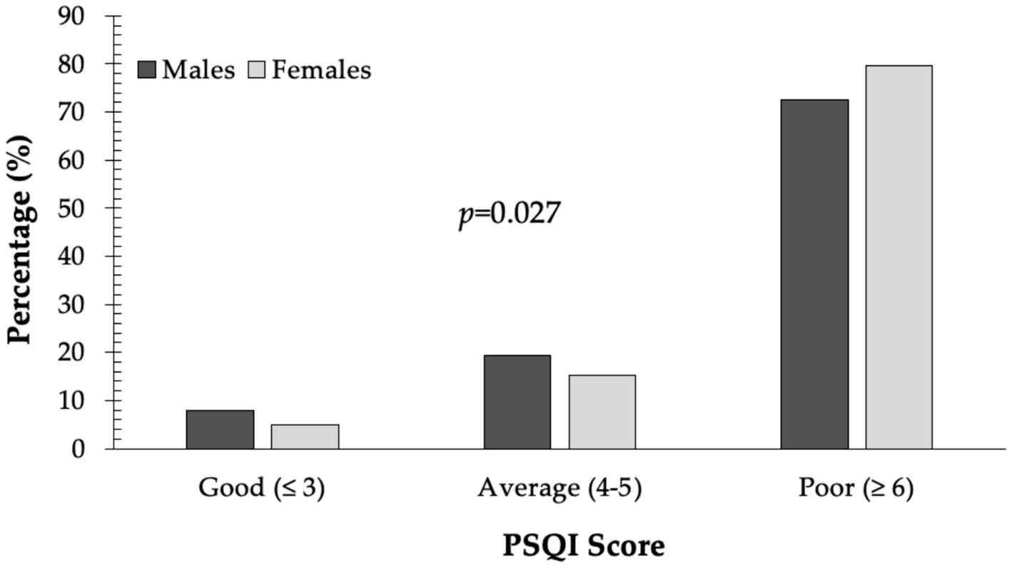 An overwhelming 77.4% of respondents had PSQI scores above 6, while only 6% were categorized as having “good” sleep quality. Poor sleep was significantly more prevalent in females than males (79.7% vs. 72.6%; p = 0.027) (Figure 1).