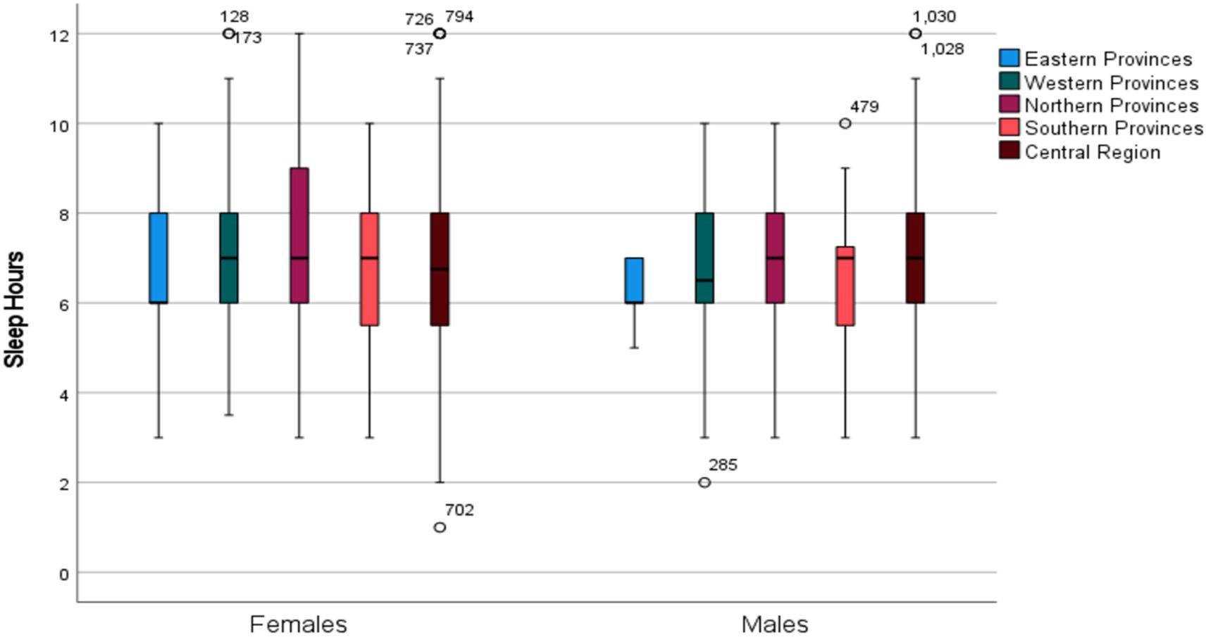 Interestingly, males from the Eastern Region reported the longest sleep durations compared to those from other regions, even after adjusting for age and BMI (Figure 2), a pattern not observed in females (p = 0.17).