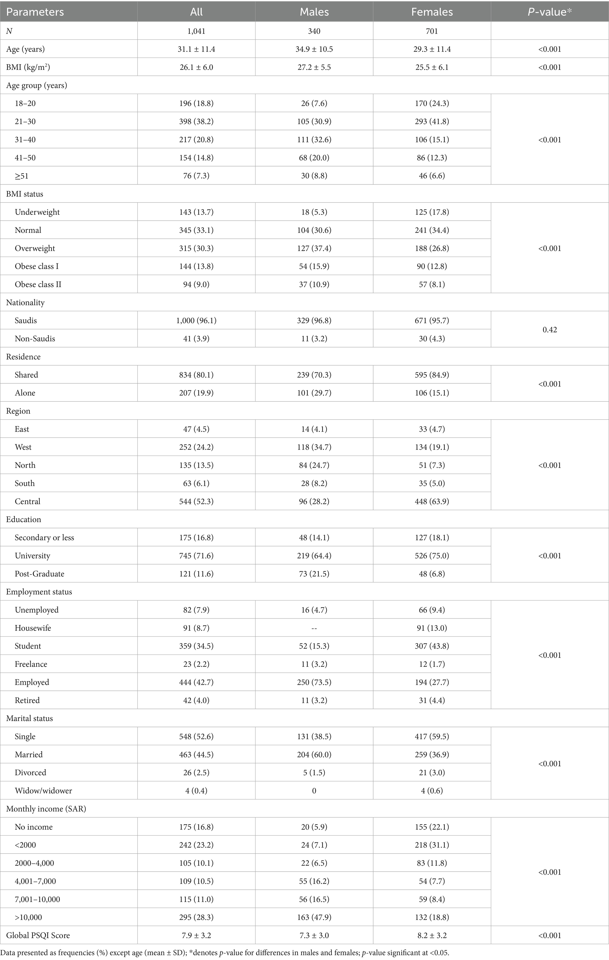 Table 1 shows the demographic characteristics of the respondents. Males were significantly older than females (p < 0.001), with most males aged 31–40 years (32.6%) and most females aged 21–30 years (41.8%). Males also had significantly higher BMIs and a greater prevalence of overweight and obesity (p < 0.001). Saudis made up 96% of the sample, with no significant gender difference. About 80% lived in shared accommodation, though males were more likely to live alone (29.7%) than females (15.1%; p < 0.001). While over half of all respondents were from the Central Region, most males came from the Western Region, and most females from the Central Region (p < 0.001). A total of 71.6% held a university degree; higher education was more common among males (21.5%) than females (6.8%; p < 0.001). Nearly 75% of males were employed compared to 27.7% of females (p < 0.001). Marriage was also more prevalent among males (60%) than females (36.9%; p < 0.001). Regarding income, 65% of females had no income or earned under 4,000 SAR/month versus 19.5% of males (p < 0.001). Both genders had poor mean PSQI scores, with females showing significantly worse sleep quality (p < 0.001).