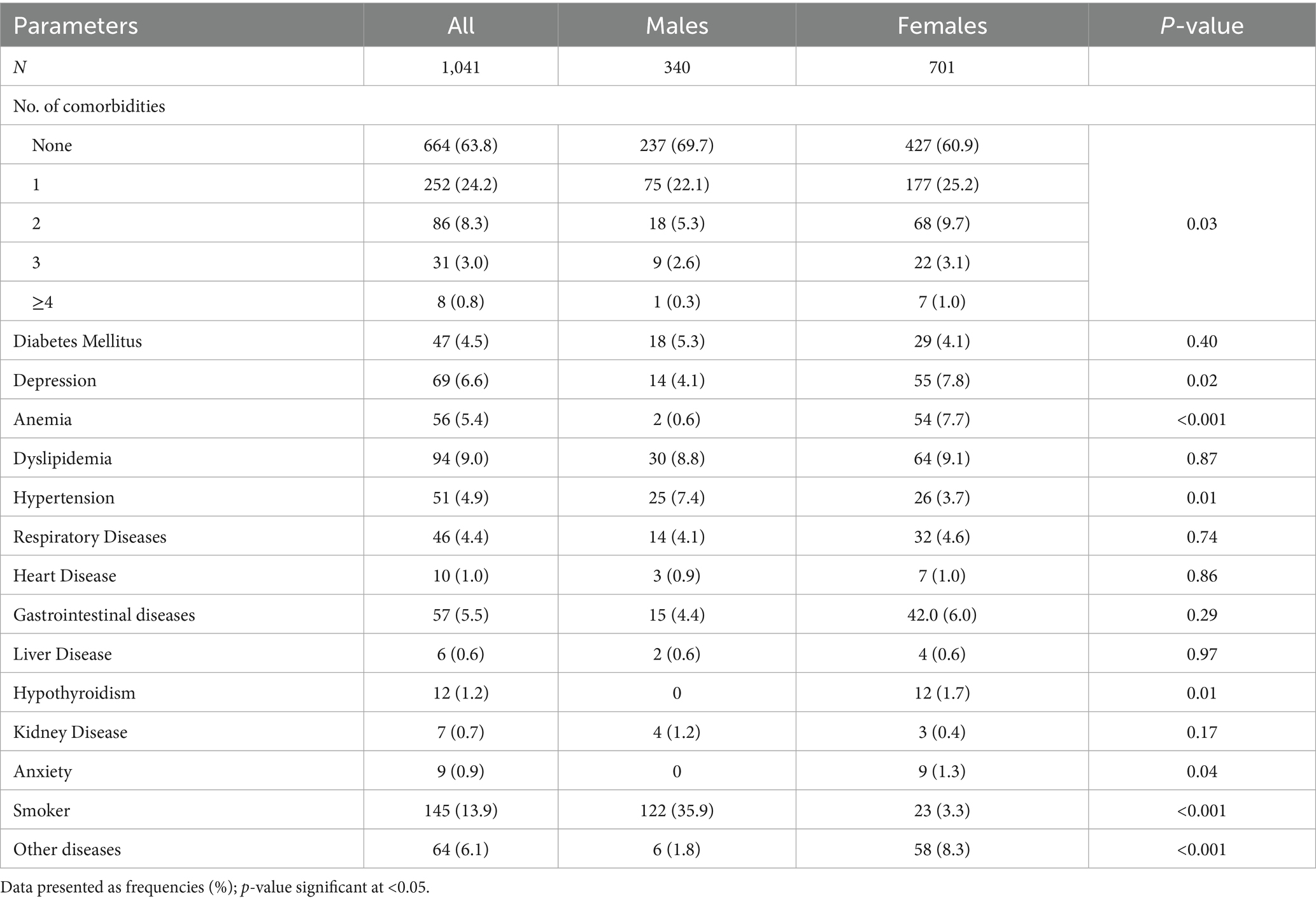 Table 2 presents the medical histories of the respondents. Multiple comorbidities were more common among females than males (p = 0.03). Dyslipidemia was the most frequent condition in both sexes (8.8% males, 9.1% females; p = 0.87). Among females, dyslipidemia was followed by depression (7.8%), anemia (7.7%), and gastrointestinal disorders (6.0%), all significantly higher than in males (4.1, 0.6, and 4.4%; p = 0.02, <0.001, and 0.29, respectively). Smoking prevalence was significantly higher in males (35.9%) than females (3.3%; p < 0.001). Hypertension was also more common in males (7.4%) than females (3.7%; p = 0.01). Anxiety was reported by nine participants, all females. Additionally, other unspecified diseases were more prevalent in females (p < 0.001).