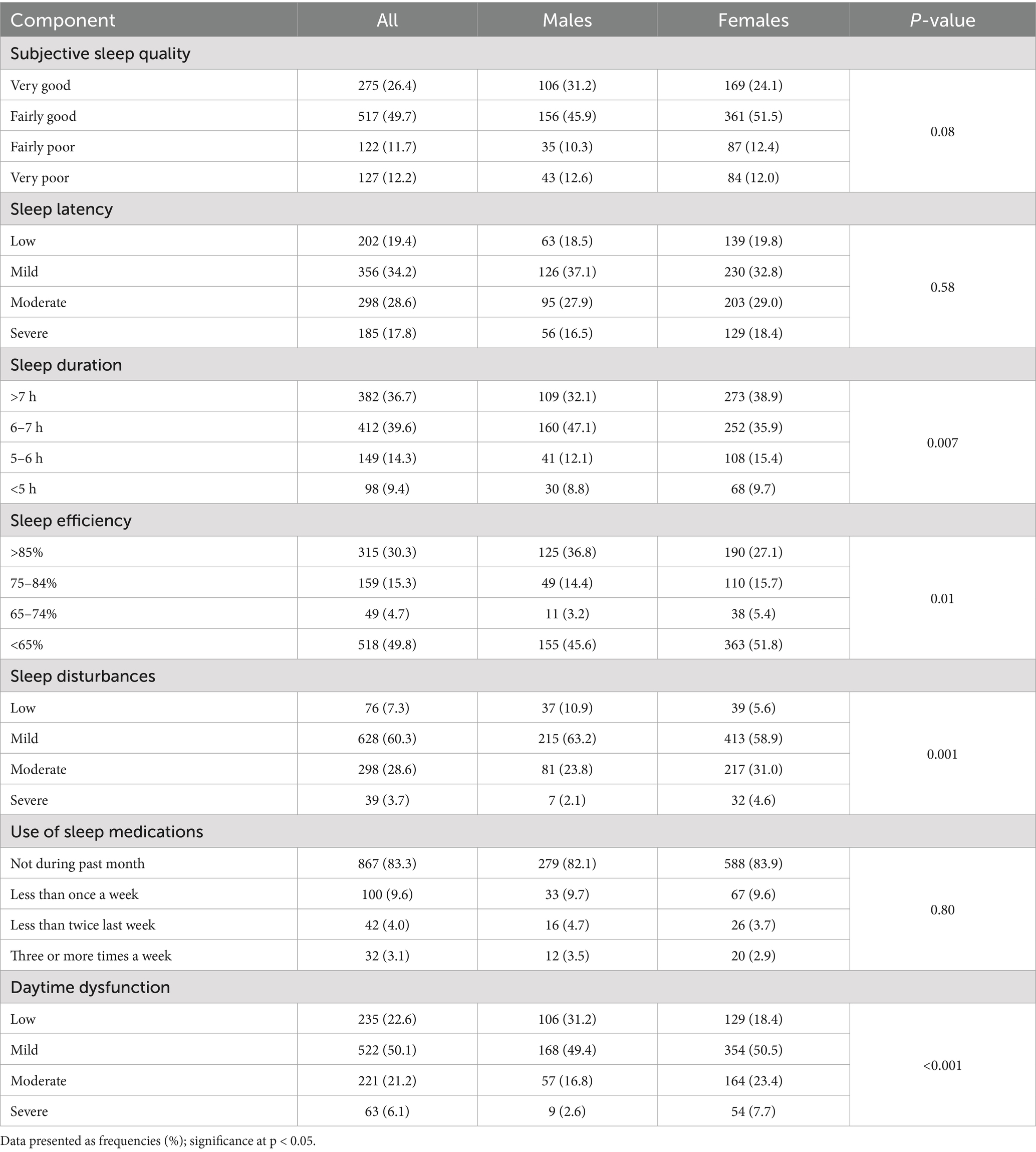 Table 3 presents sleep characteristics based on the seven PSQI components. Only 26.4% reported very good subjective sleep quality, with males slightly better than females (31.2% vs. 24.1%; p = 0.08). About 12% reported very poor sleep quality. No gender differences were found in sleep latency, though 17.8% had severe latency. Over 75% slept 6+ h, but nearly half of males reported 6–7 h of sleep, compared to 36% of females (p = 0.007). Females had significantly higher rates of <65% sleep efficiency (51.8% vs. 45.6%; p = 0.01), moderate to severe sleep disturbances (35.6% vs. 26.9%; p < 0.001), and daytime dysfunction (31.1% vs. 19.4%; p < 0.001). Medication use was similar between genders, with over 80% reporting no use in the past month (Table 3).