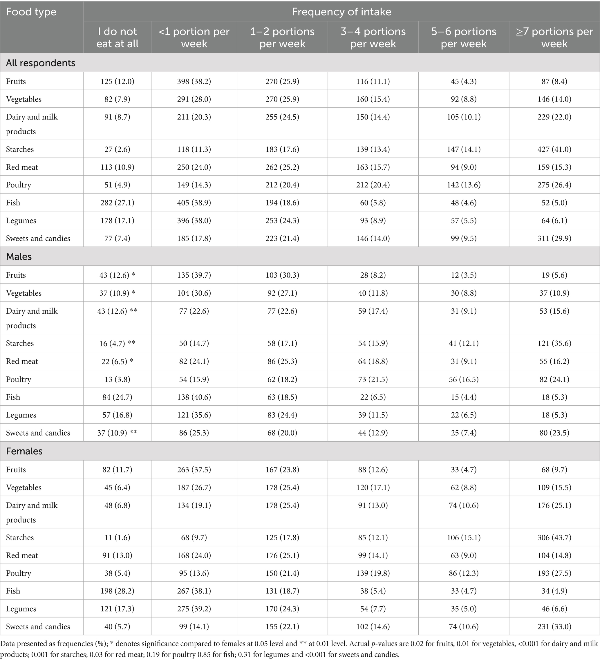 Table 4 presents weekly consumption frequencies of major food types. Most respondents consumed less than one portion per week of fruits (38.2%), vegetables (28%), fish (38.9%), and legumes (38%). Frequently consumed foods (≥7 portions/week) included starches (41%), poultry (26.4%), and sweets (29.9%). Significant gender differences emerged: males consumed fewer fruits, vegetables, and dairy, while females more frequently consumed starches, poultry, and sweets (Table 4).