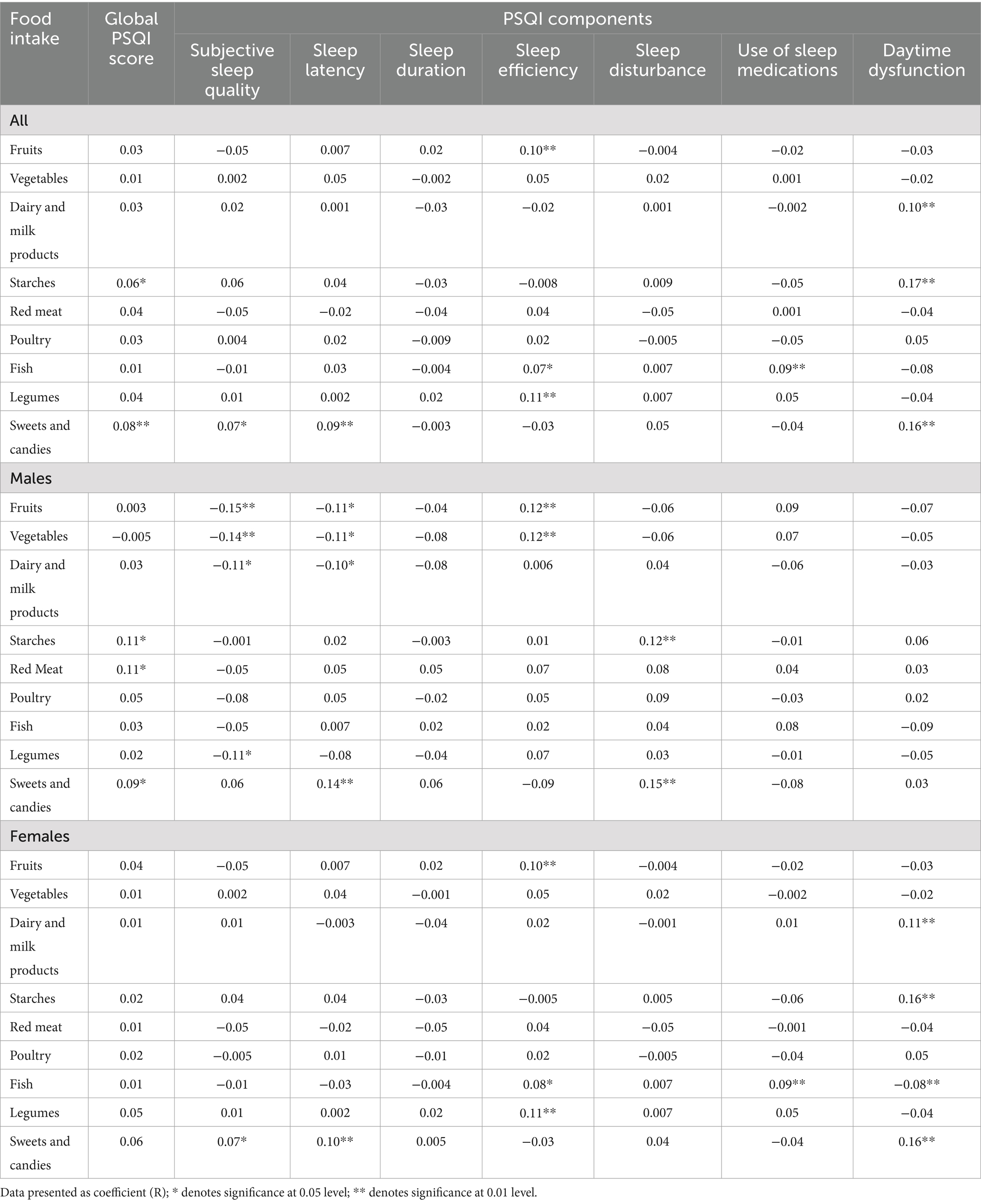 Table 5 shows gender-specific correlations. In males, higher intake of fruits, vegetables, dairy, and legumes was significantly and inversely associated with subjective sleep quality. Fruits, vegetables, and dairy were also inversely related to sleep latency. Fruit and vegetable intake was significantly associated with better sleep efficiency. Conversely, higher intake of sweets and candies was significantly associated with longer sleep latency, and both sweets and starches were linked to more sleep disturbances (all p-values < 0.05).