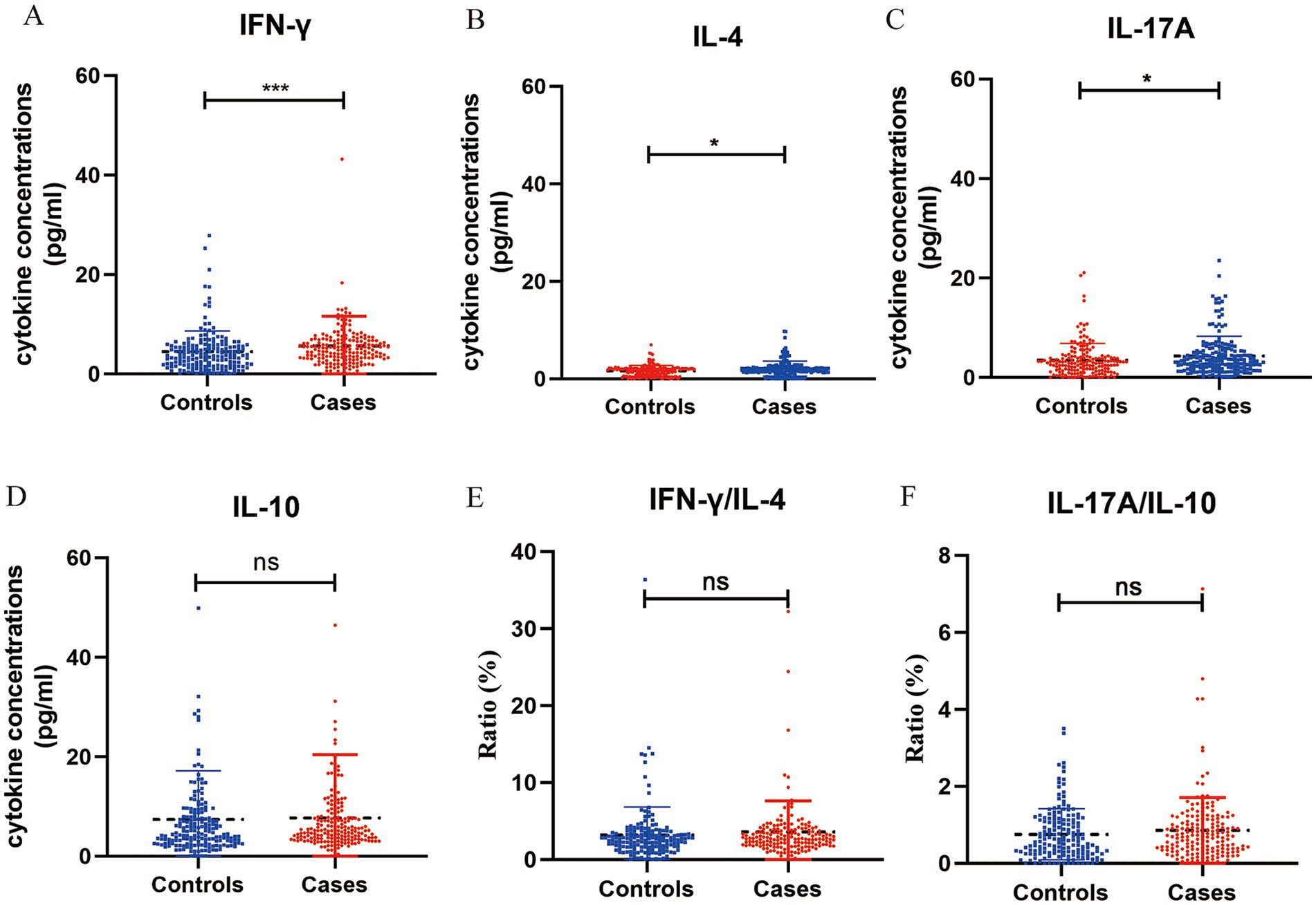 Figure 1. Concentration of cytokines in plasma samples from pregnant women with preeclampsia (n = 192) and without preeclampsia (n = 181). The concentration of interferon (IFN)-γ (A), IL-4 (B), IL-17A (C), IL-10 (D) (pg/mL) were measured in both groups using ELISA, the ratio of IFN-γ/IL-4 (E) and IL-17A/IL-10 (F). *p < 0.05, **p < 0.01, ***p < 0.001, and nsp > 0.05.