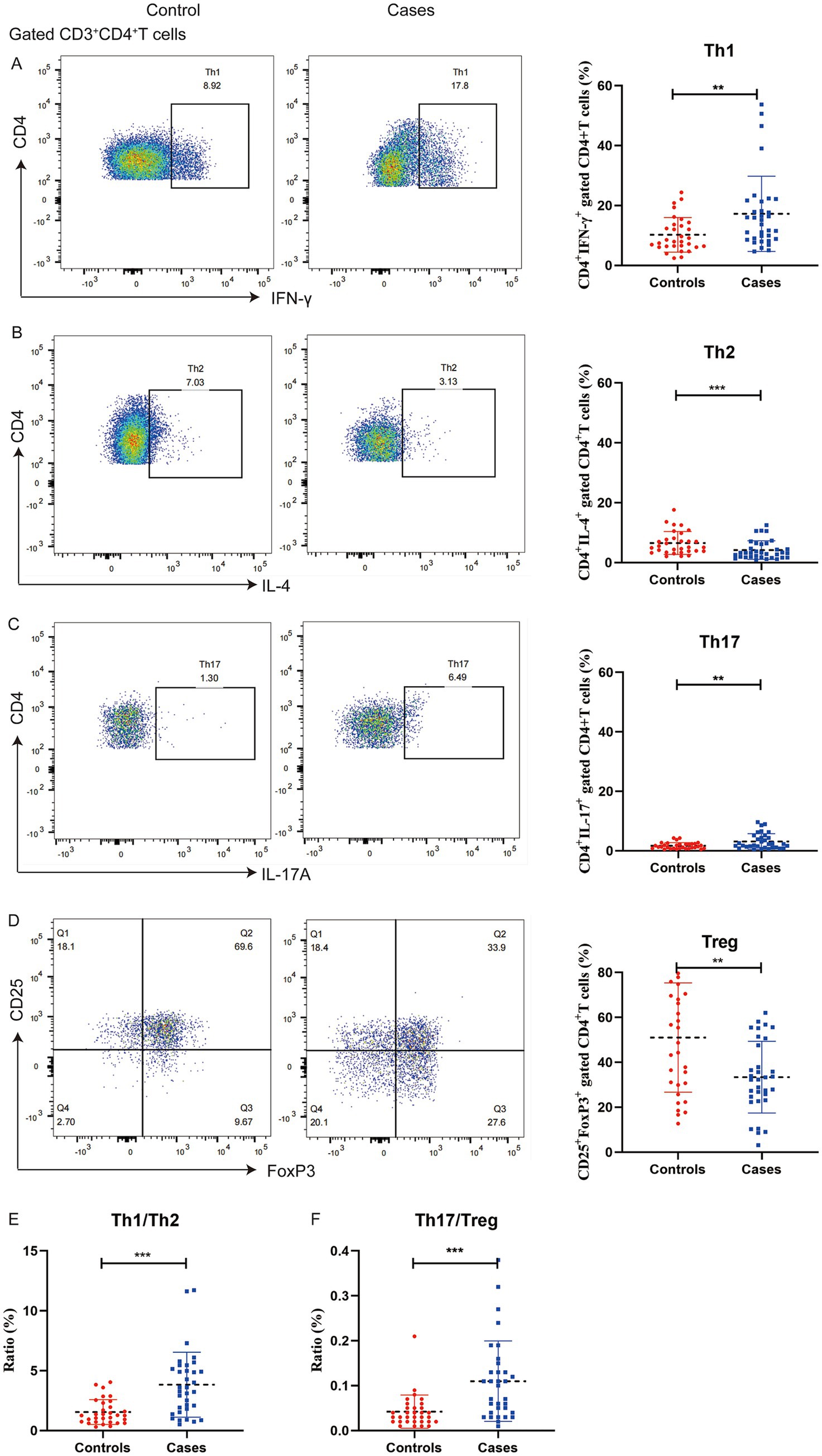 Figure 2. Distribution of T cell subsets in peripheral blood mononuclear cells from pregnant women with preeclampsia (n = 34) and without preeclampsia (n = 31). The percentages of IFN-γ+ of CD4+ T cells (A), IL-4+ of CD4+ T cells (B), IL-17A+ of CD4+ T cells (C), and CD25+ FOXP3+ of CD4+ T cells (D) were determined using flow cytometry, the ratio of Th1/Th2 (E) and Th17/Treg (F). **p < 0.01 and ***p < 0.001.
