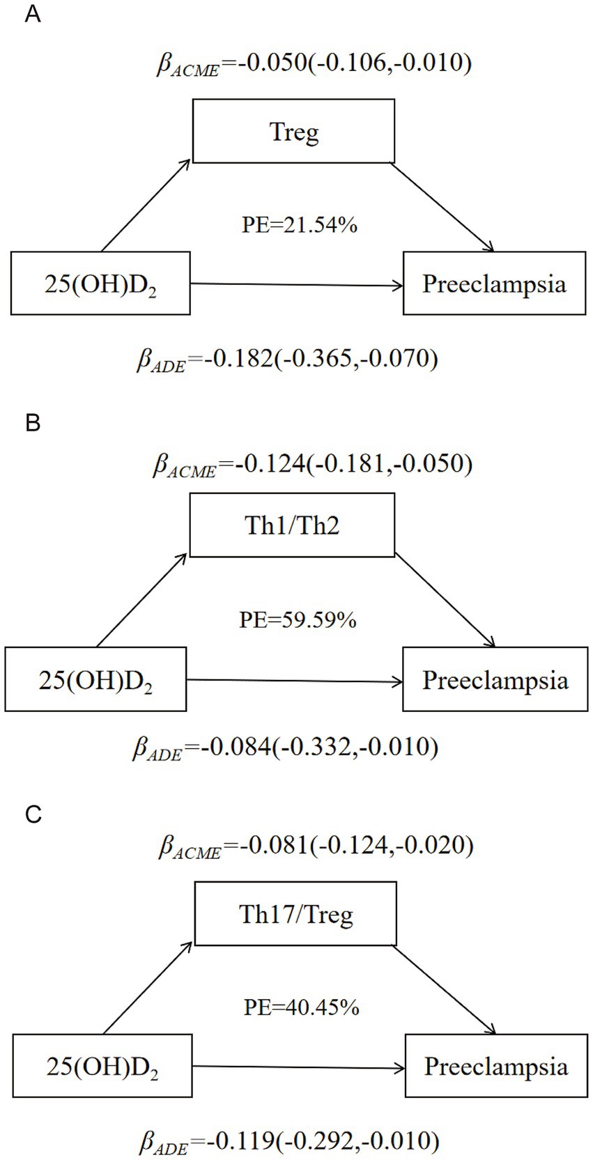 Figure 3. Model of the mediation effects of immune balance on the correlation between 25(OH)D2 and preeclampsia. (A) The mediating effect of Treg on the correlation between 25(OH)D2 and preeclampsia. (B) The mediating effect of Th1/Th2 balance on the correlation between 25(OH)D2 and preeclampsia. (C) The mediating effect of Th17/Treg balance on the correlation between 25(OH)D2 and preeclampsia. Maternal age, gestational week, parity (multiparous or primiparous), pre-pregnancy BMI, education level (high school or below, university or above) and monthly income (≤4,000 RMB or >4,000 RMB).